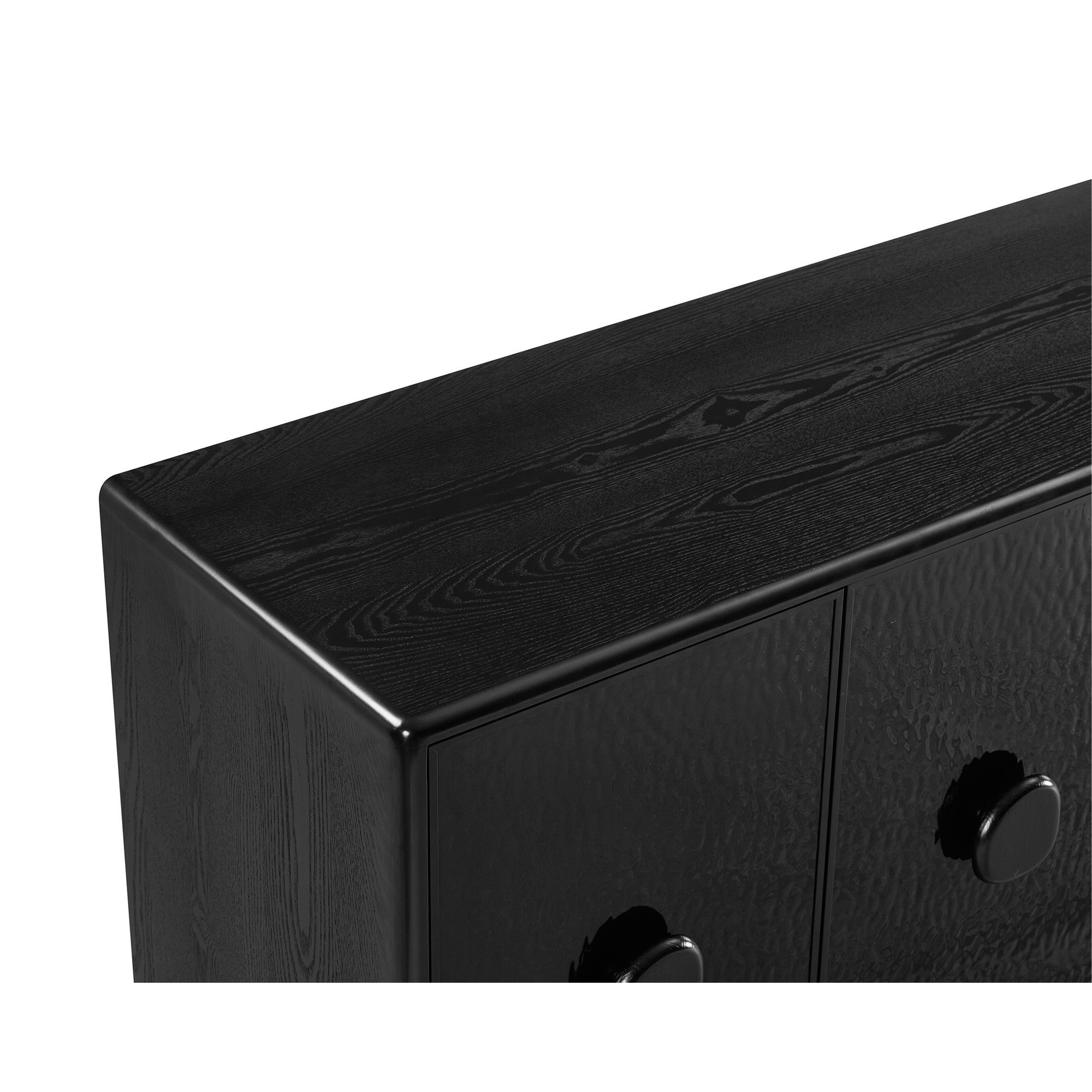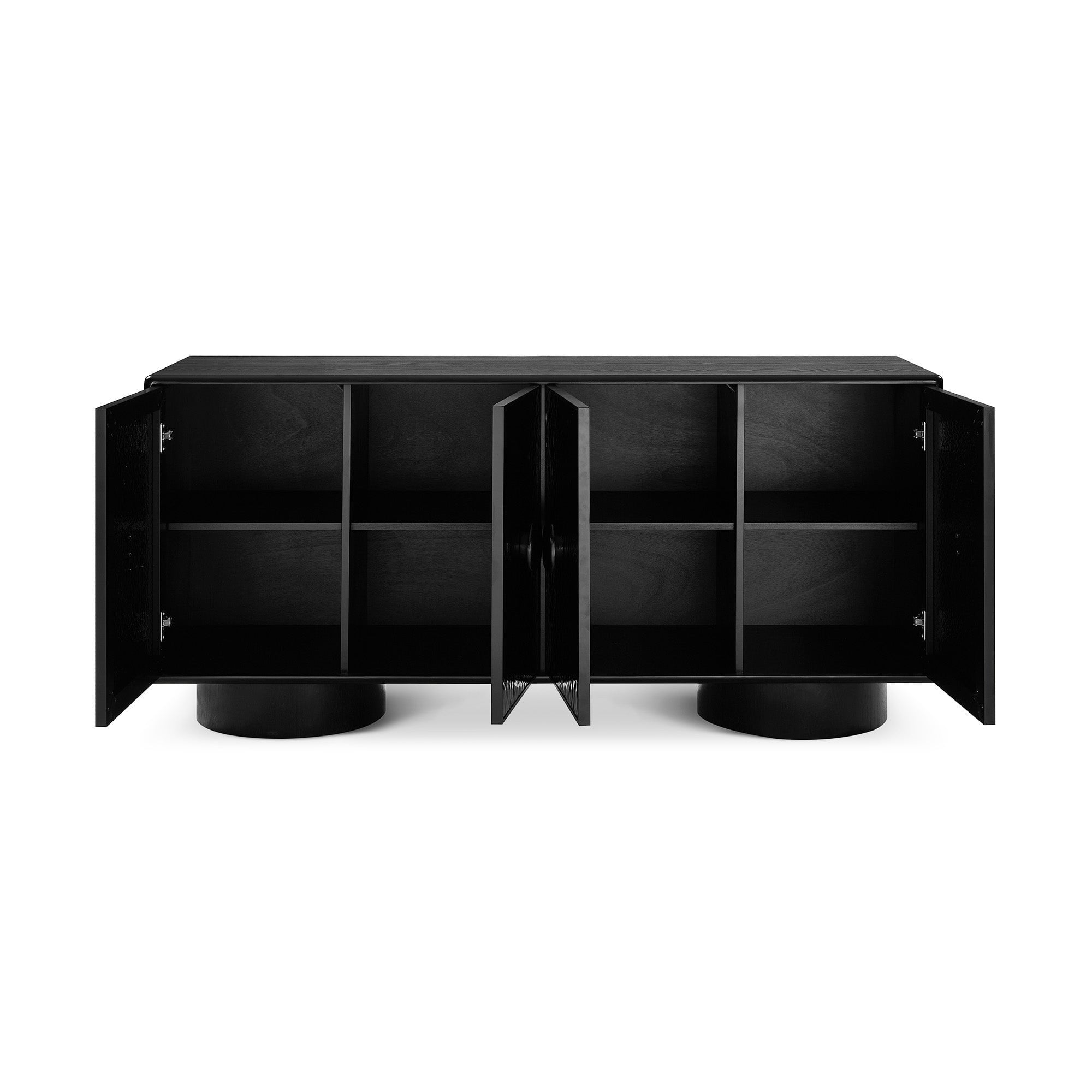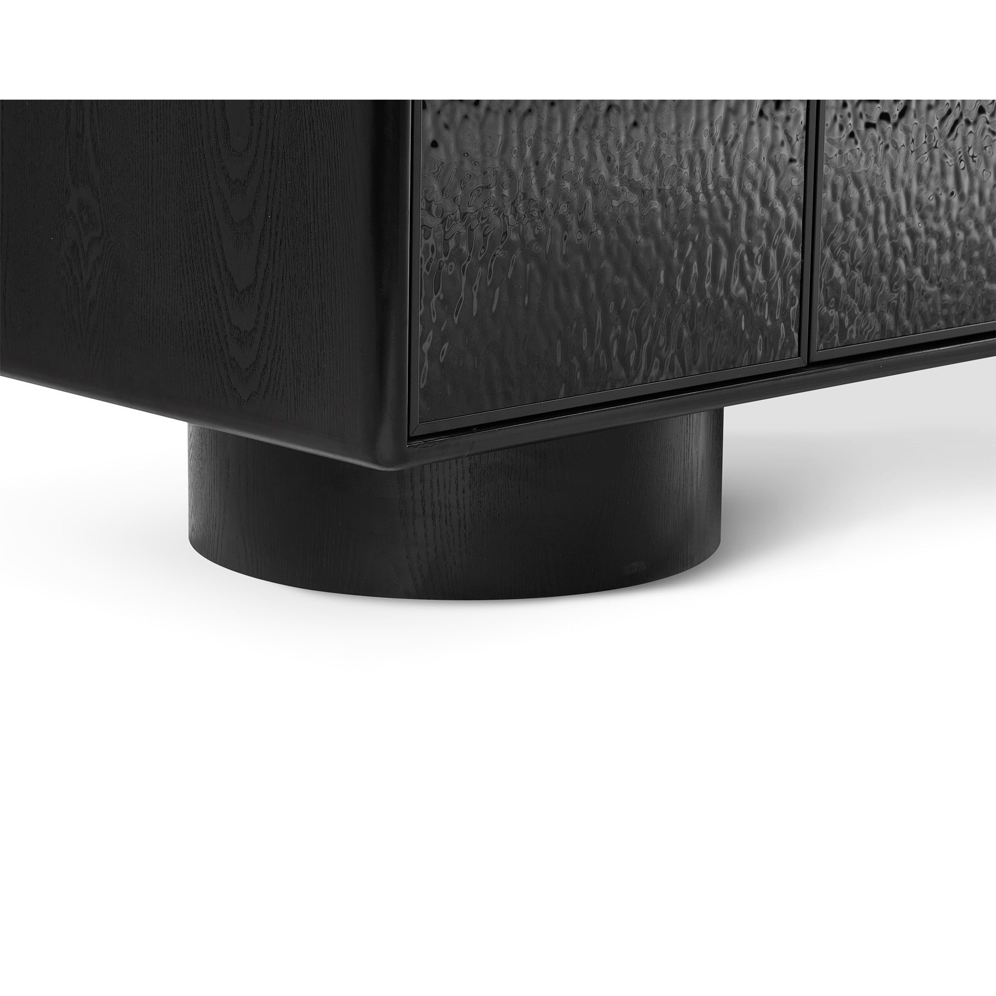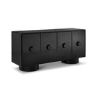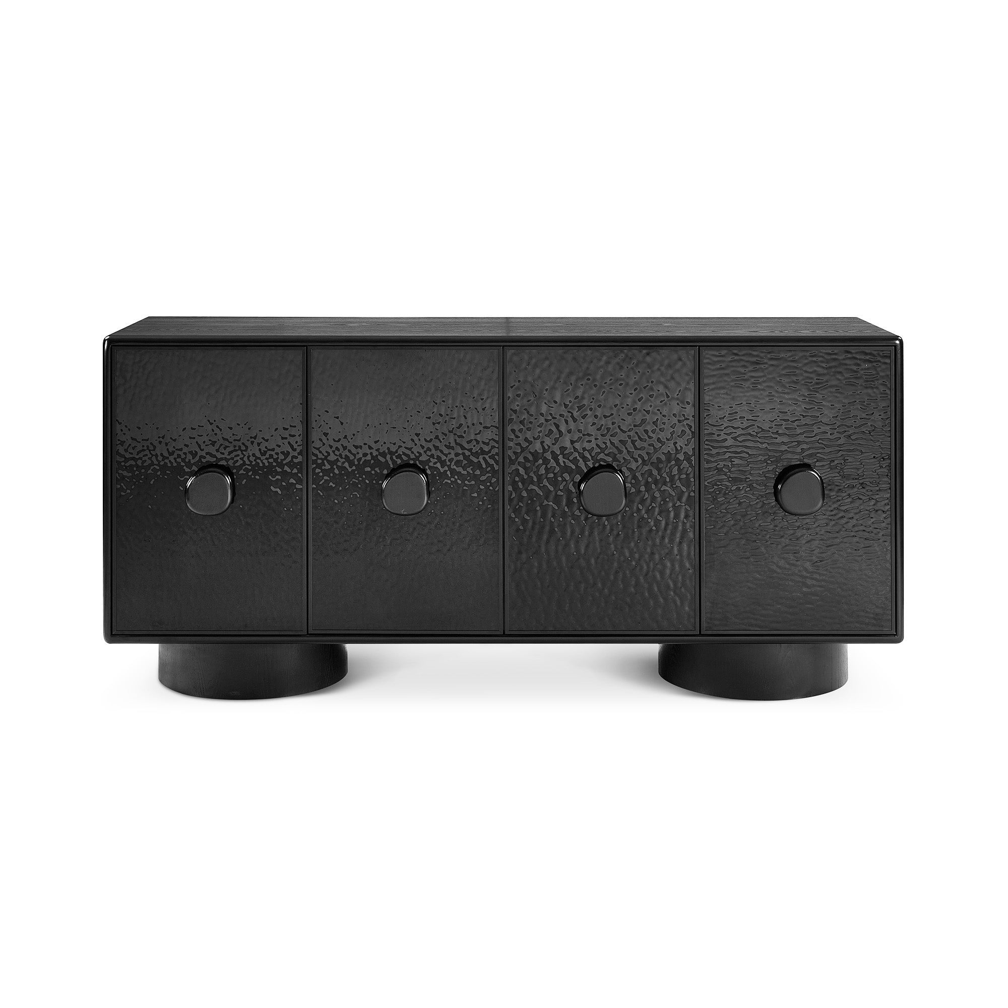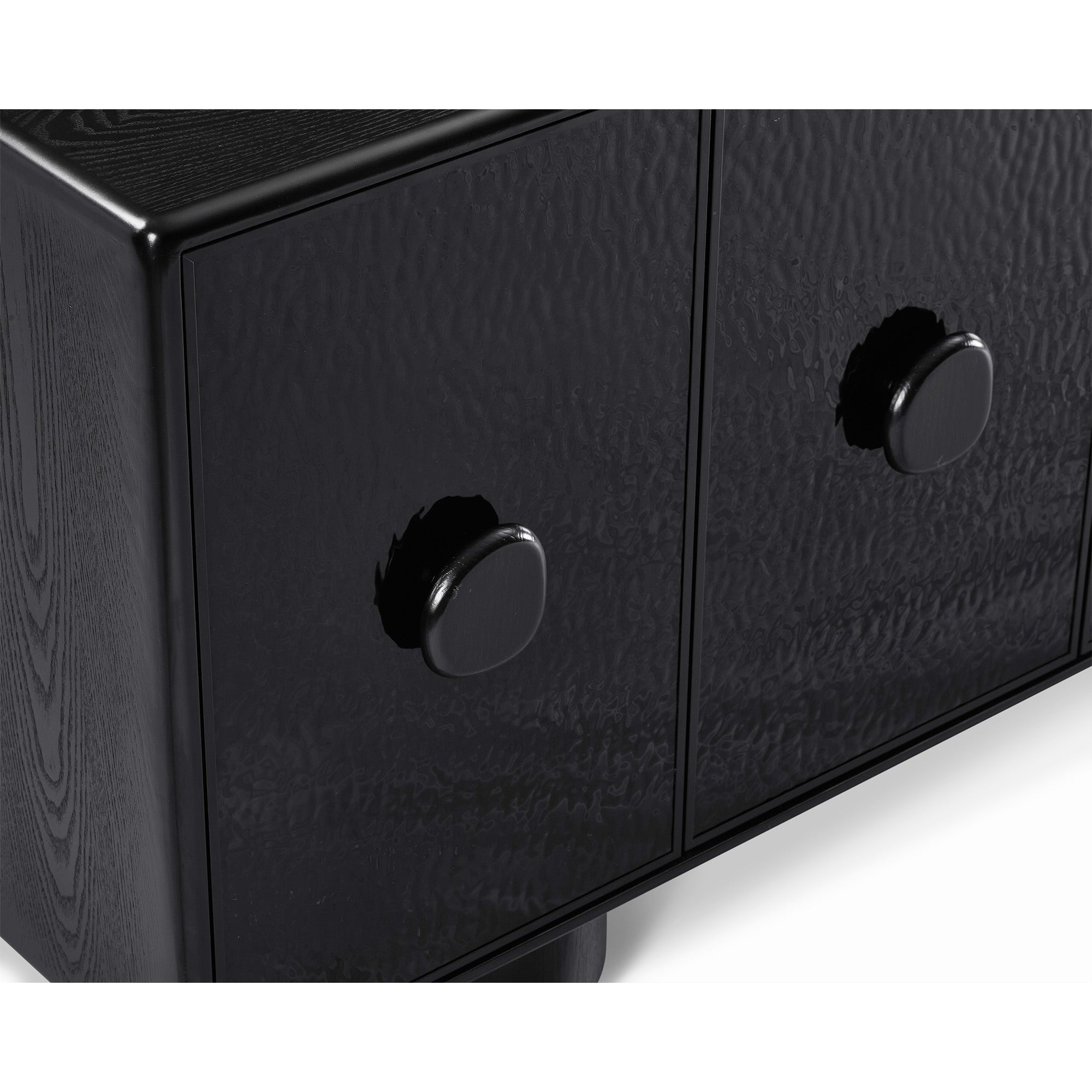 Make a statement with the Sintra Sideboard, featuring a bold black oak veneer and striking wave design. Its standout round knobs contrast beautifully with its sleek surfaces, offering a modern solution for stylish storage. Perfect for hospitality or residential spaces, this sideboard combines function with elegance.