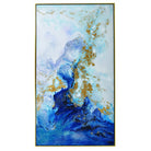 Contemporary abstract framed canvas with waves of monochromatic blues finished with pops of gold.