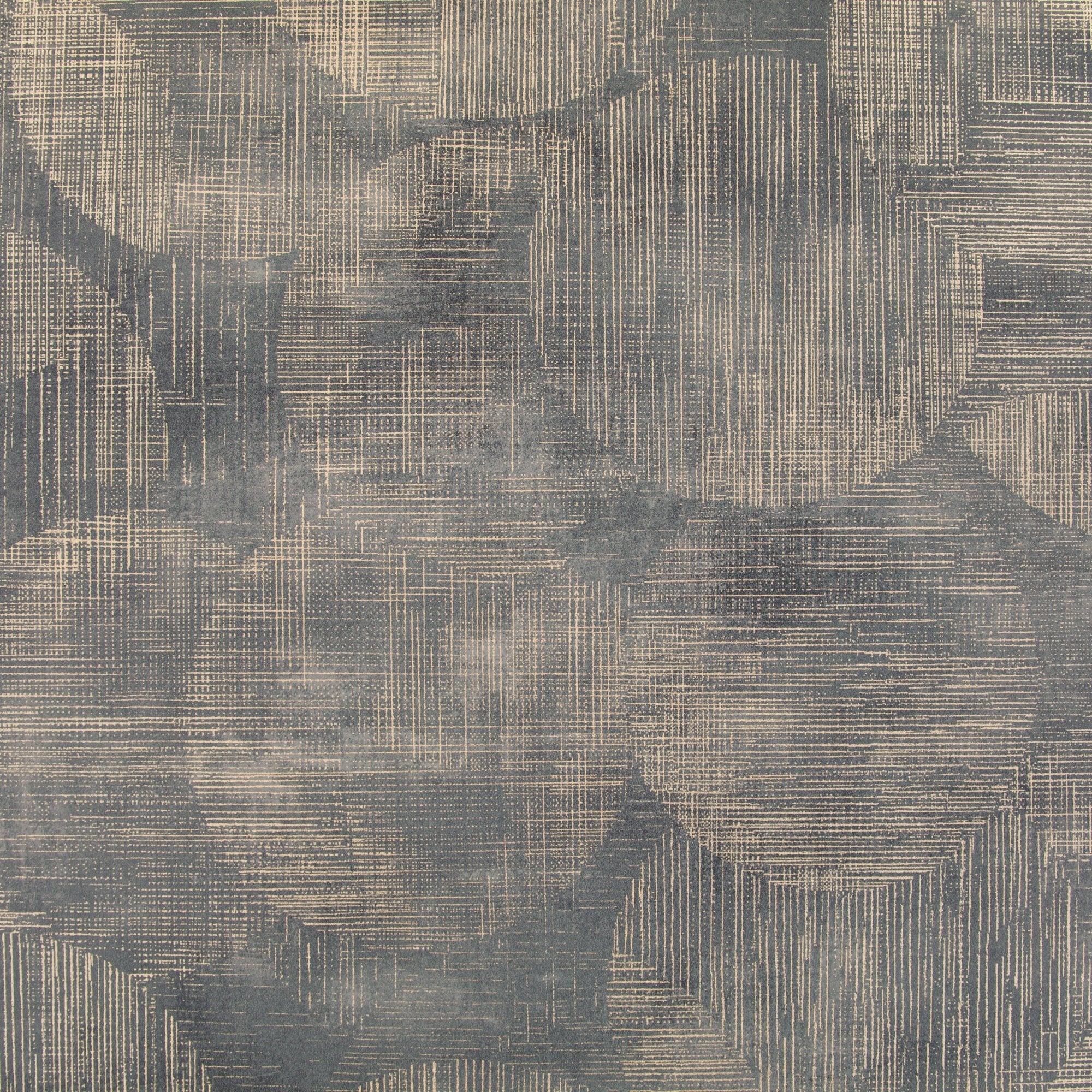 Dramatic artistry with striking patterns and colours combine with intricate detail. Waves of blurred horizon lines ripple in a colourful stream, whilst floating overlapping spheres in sophisticated tones of mustard and deep blue sit alongside bold geometric designs with softly diffused edges and an eye-catching velvety flocked design of intricate lines.