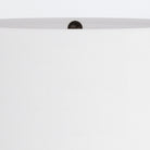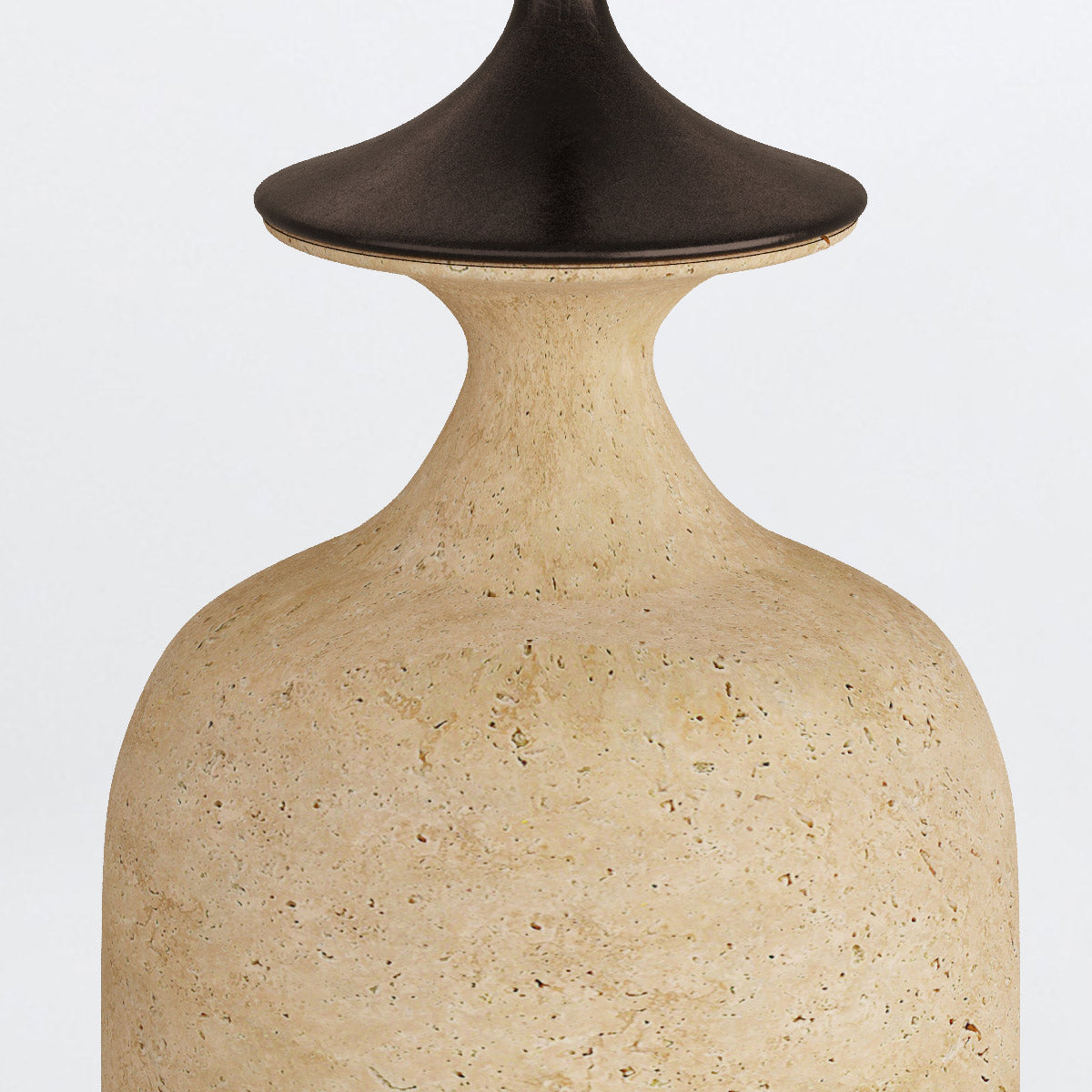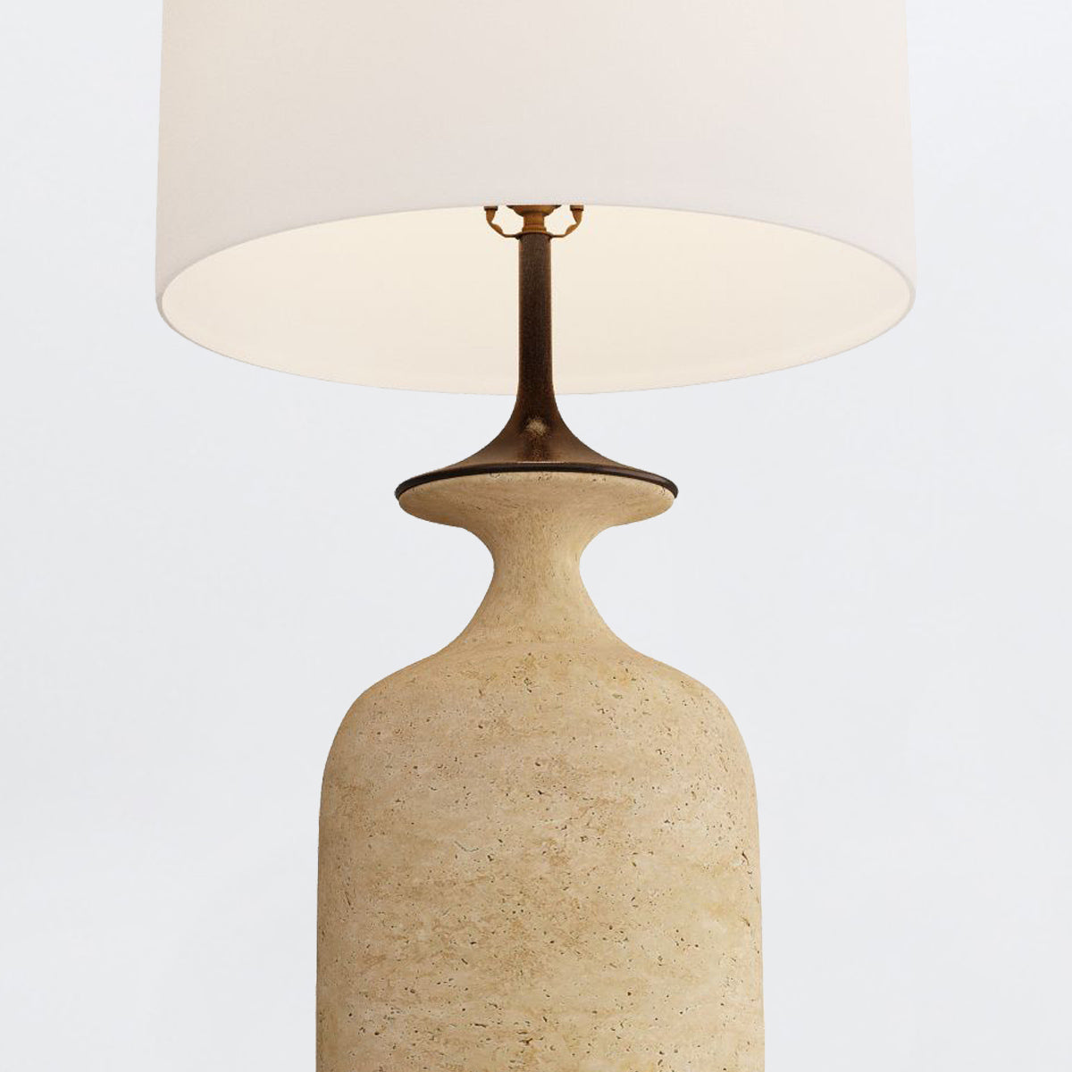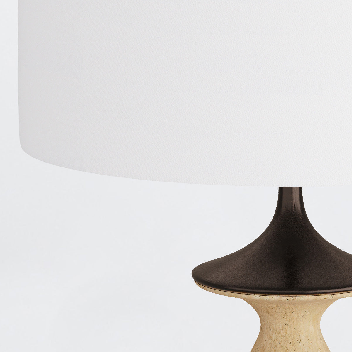Inspired by the shape of a tulip, the Bridgeport is updated in a modern mix of materials. A base of faux travertine in a neutral sand shade curves elegantly to embrace an English bronze detail. Its drum shade of off-white linen with off-white cotton lining, it is anchored with a matching sphere of English bronze. Taupe cloth cord and three-way rotary switch. Finish will vary.