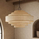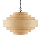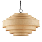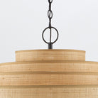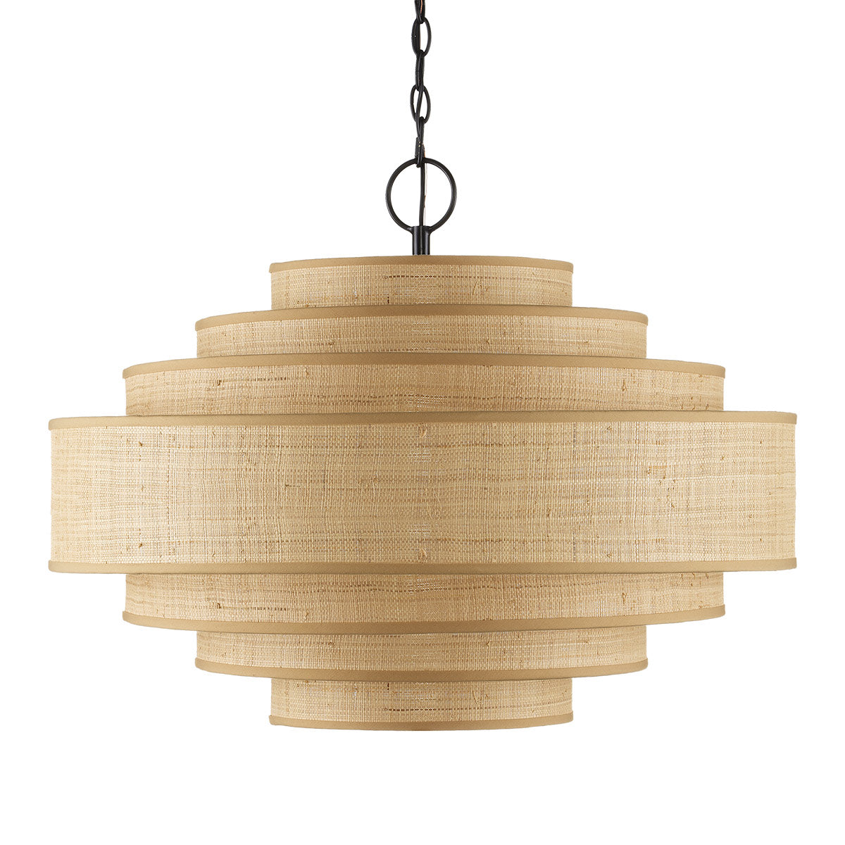 The grasscloth cylinders that make up the Maura Natural Pendant bring an elevated design statement to the fabric shades on this tan pendant. The metal frame in a satin black finish is a contrasting element to the natural grasscloth shades, which are trimmed for a more sophisticated profile. Though on the surface this design is seriously simple; it is far from it, as the uniformity of the layered shades seen when looking up into the fixture is a precise effort that takes great skill.