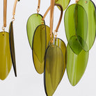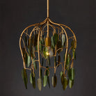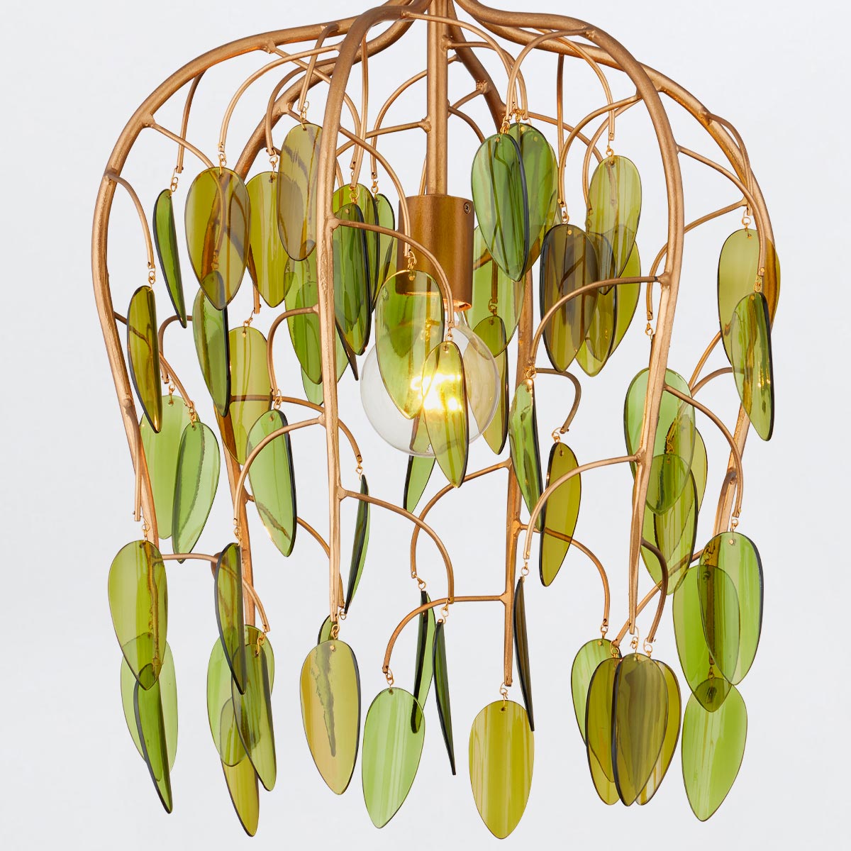 As lovely as a dangling blossom that calls to mind a balmy evening, the Midsummer Pendant blooms with artistry. A steel frame that tapers from a clean-lined rod to thin tendrils as it graduates toward the bottom dangles curved petals made of recycled glass. The green and amber pieces retain the original colors of the beverage bottles from which they were taken. Because this fixture is artisanal, the configuration of the glass colors will vary slightly, which makes each green and gold pendant unique.