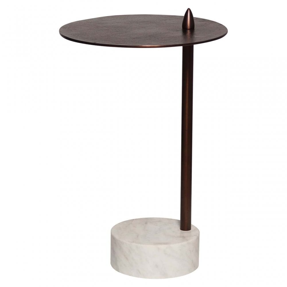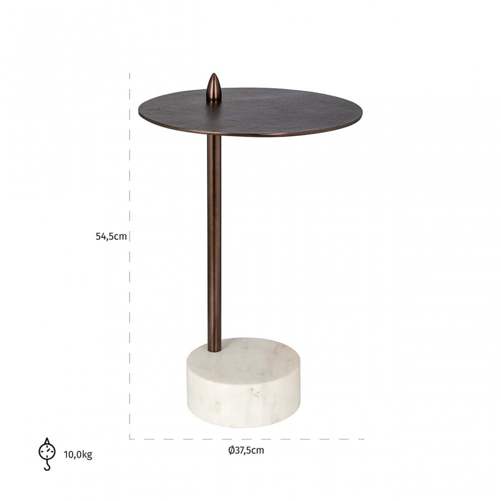 This striking piece features a round white marble base that exudes sophistication, supporting a sleek metallic frame that extends to a textured metal table top. The harmonious blend of materials and design creates a functional yet eye-catching statement piece.