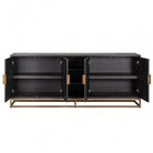 This modern sideboard features a sturdy brass frame, four doors that open to reveal enclosed storage, and two open shelves perfect for displaying decorative accents. Designed with coordination in mind, the Blackbone range offers complementary pieces that seamlessly blend colors and styles.