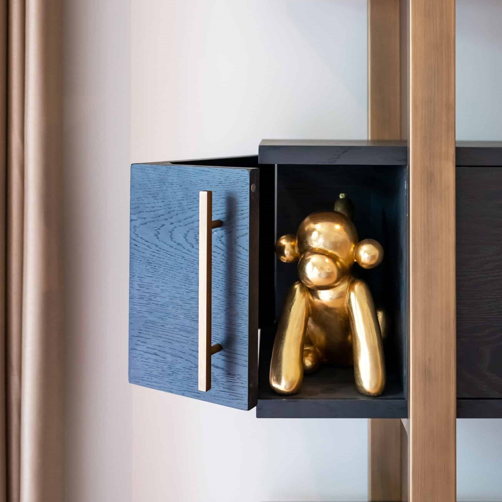 The Cambon combines dark oak veneer in a rich coffee tone with steel accents in antique gold. Each piece is crafted from a sophisticated blend of wood and metal, resulting in a bold and luxurious look. The sleek cabinets and tables are complemented by matching coffee tables, making the collection a perfect fit for both modern and hotel-chic interiors.