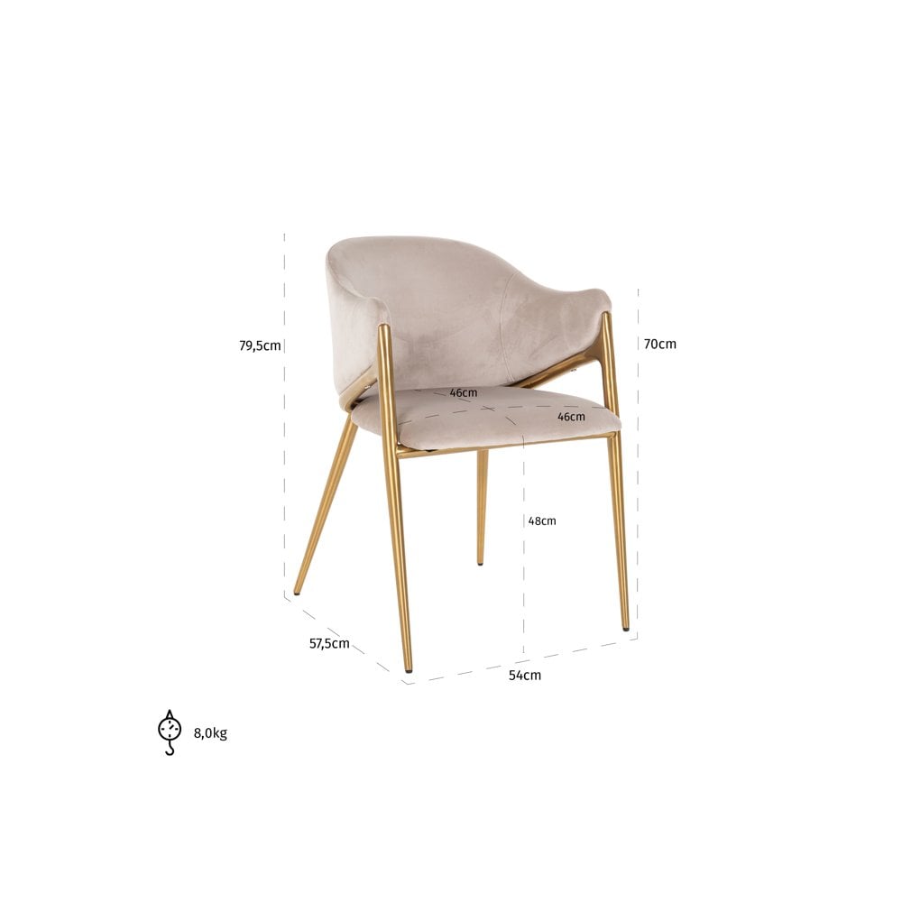 The Gwen chair, in captivating khaki velvet with brushed brass metal legs, seamlessly transitions from a stylish accent in your living room or bedroom to an elegant dining chair.