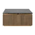 The Square Ironville is a luxurious coffee table in Mid-Century Modern style. The black marble top is combined with an antique brass-colored ribbed pattern. Available also in a round, or rectangular shape. This coffee table features a ribbed base, black frame, and genuine black marble top.