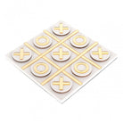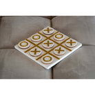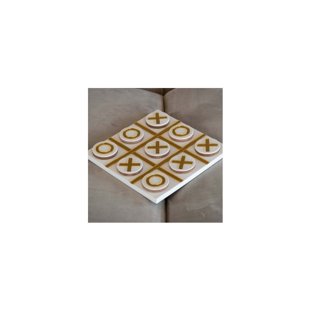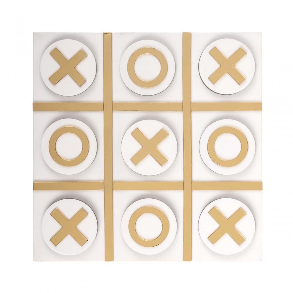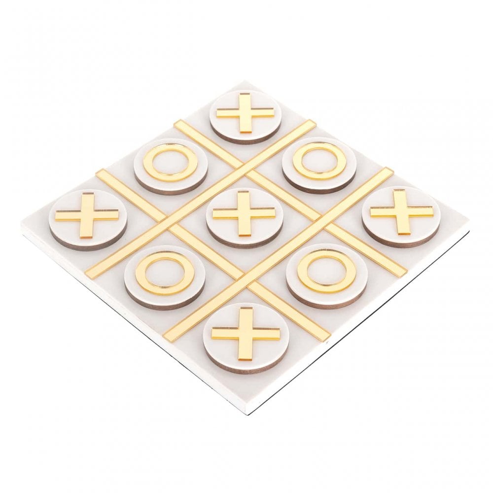 This game set makes a striking visual statement on any coffee table or desk with its sculptural playing pieces. Featuring a chic white base, the set includes 9 pieces—4 X’s and 5 O’s—finished in luxurious gold, adding a touch of glamour and playful elegance.