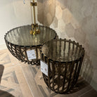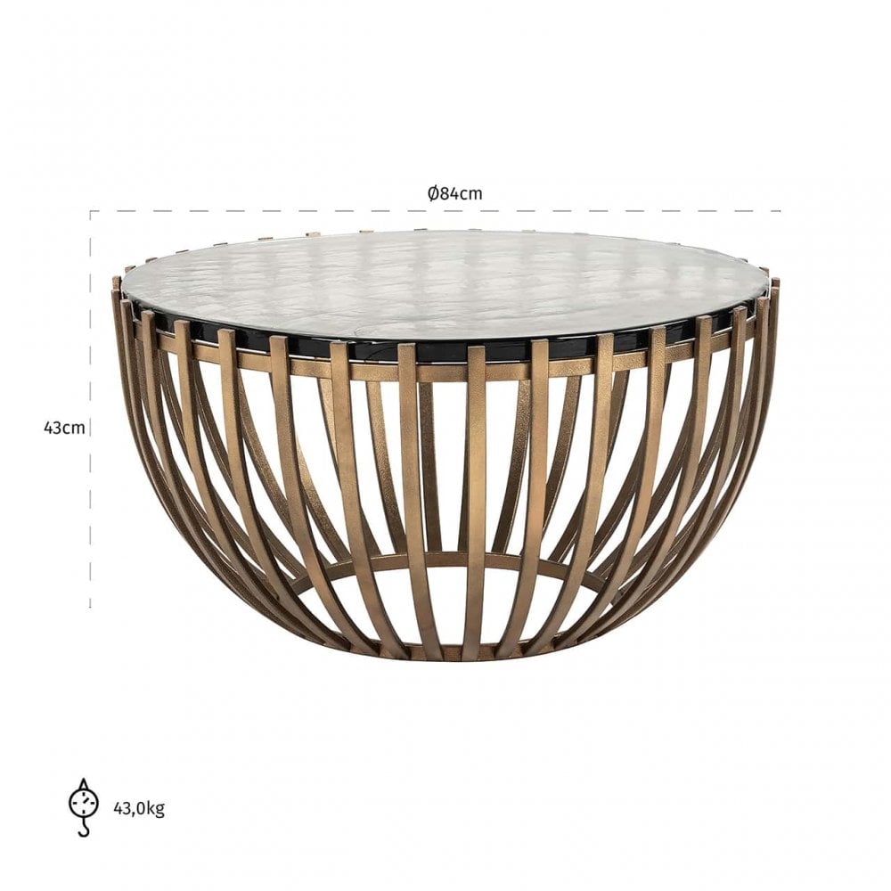 This piece captivates with its unique, eye-catching base, featuring rounded, tapered iron bars finished in antique brass. The circular, textured glass top creates a striking contrast, making it perfect for displaying your favourite items or keeping essentials within reach.