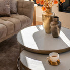 Discover the perfect fusion of natural beauty and industrial strength with the Whitebone Coffee Table from Richmond Interiors. This stunning piece combines oak veneer with iron for a modern yet sophisticated look. The dual wooden tops, finished in Verona Grey oak veneer, exude quiet elegance whether displayed on their own or in tandem. The antique brass iron frames not only provide durability but also contribute a touch of refined style.