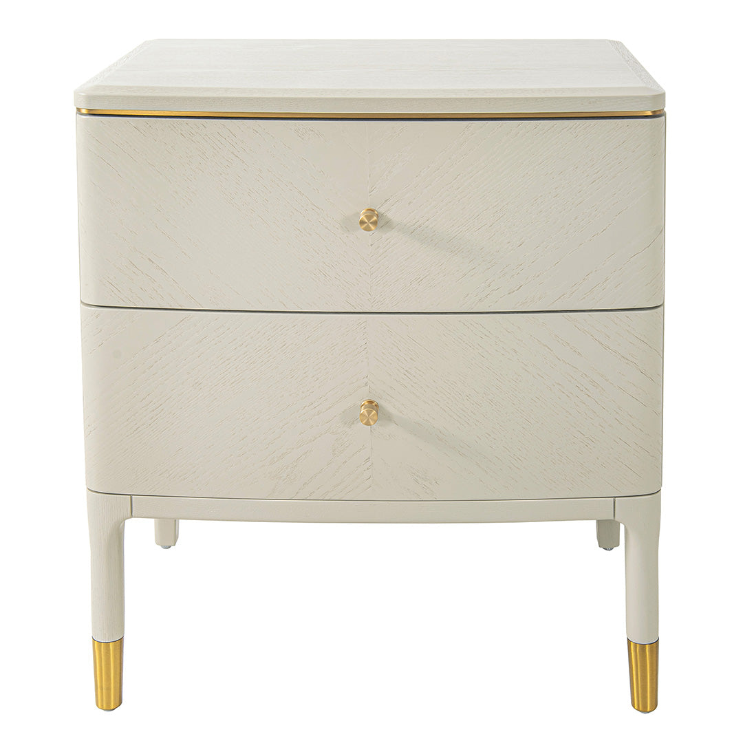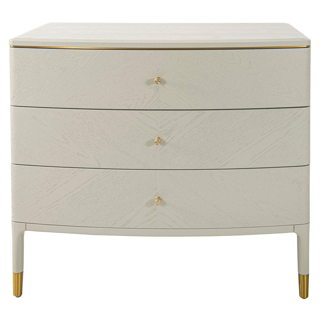 Expertly crafted in a chic off-white finish, this side table exudes lightness and charm, making it a versatile addition to both modern and classic interiors. Its standout features include striking brass handles and brushed gold front feet, adding a luxurious touch of glamour.