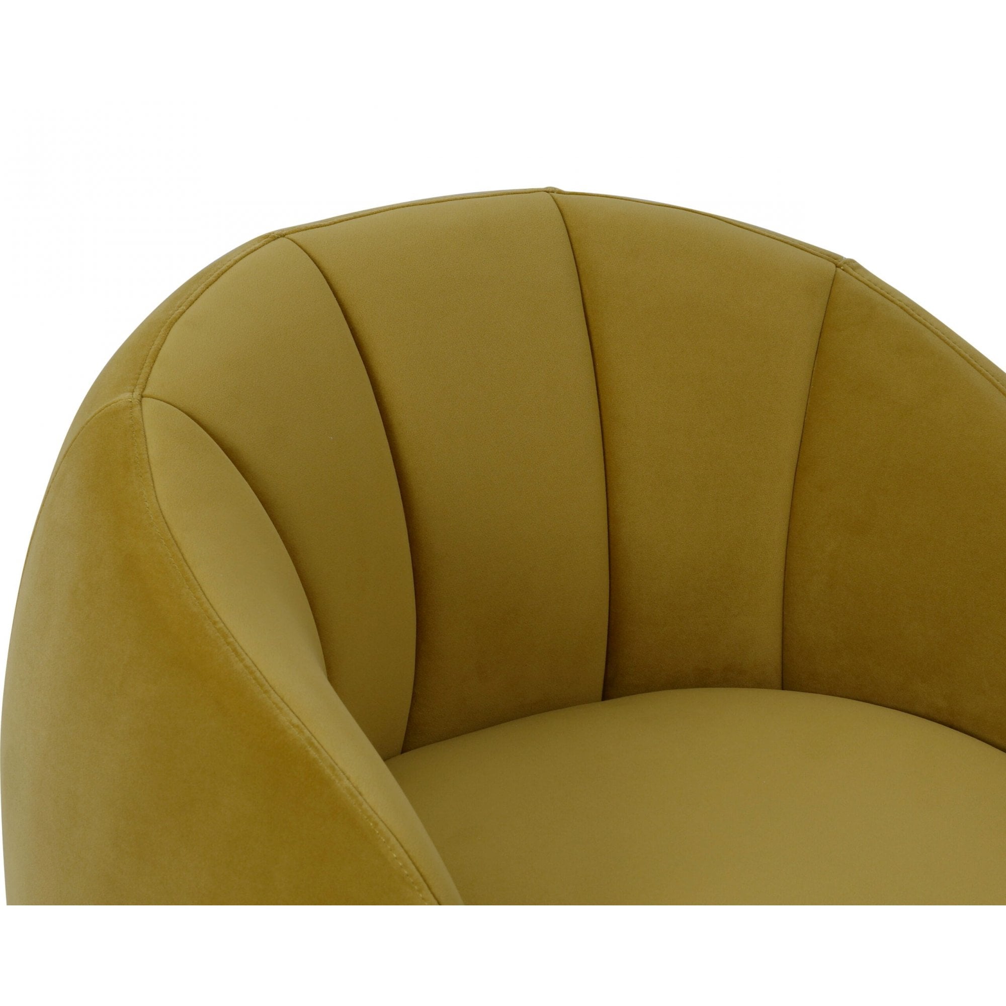 Experience the elegance of the Art Deco era with the Kaster Mustard Velvet Occasional Chair. This stunning chair features an enveloping barrel back adorned with flared channelled upholstery, paying homage to iconic designers of the time. The tightly upholstered seat and sleek recessed matt black iron base conceal a smooth 360-degree swivel mechanism, seamlessly combining comfort and style for your sophisticated living space.