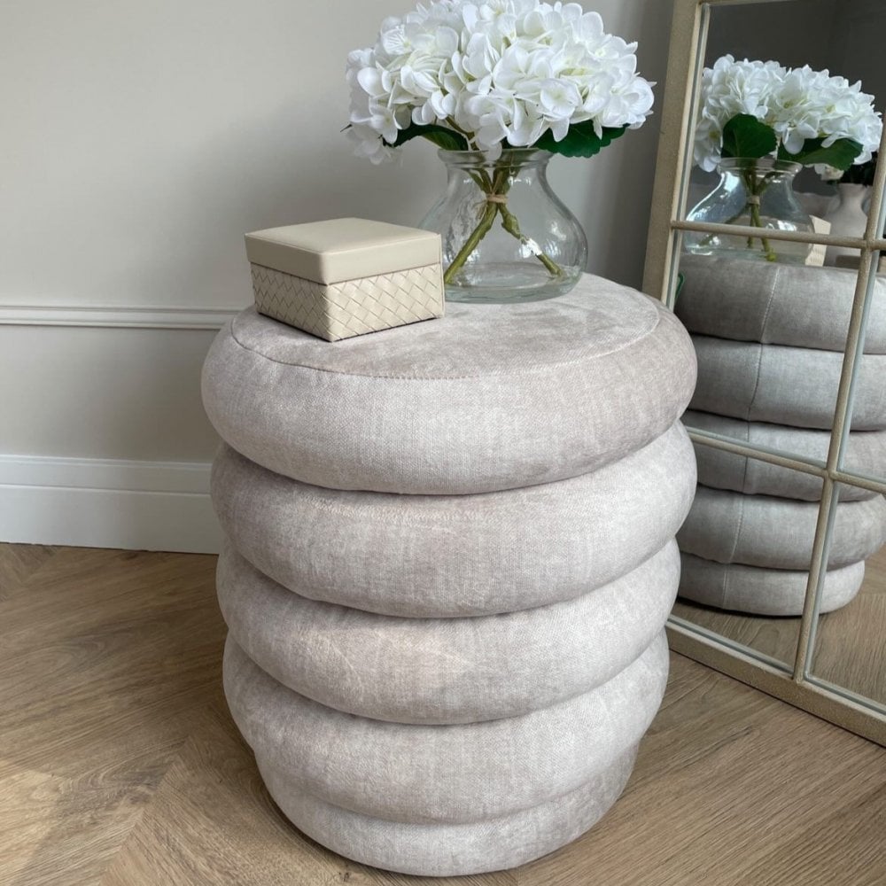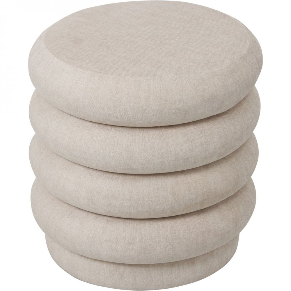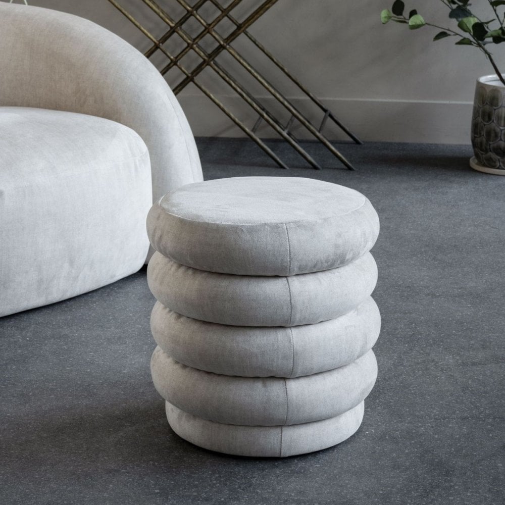 Introducing the Casa Upholstered Stool with Fabric Base in Cream, a versatile and stylish addition to any living space from Libra Interiors. With four padded bands, it offers comfort and visual appeal. The soft, cream-colored fabric complements any decor effortlessly. Also available in Grey.