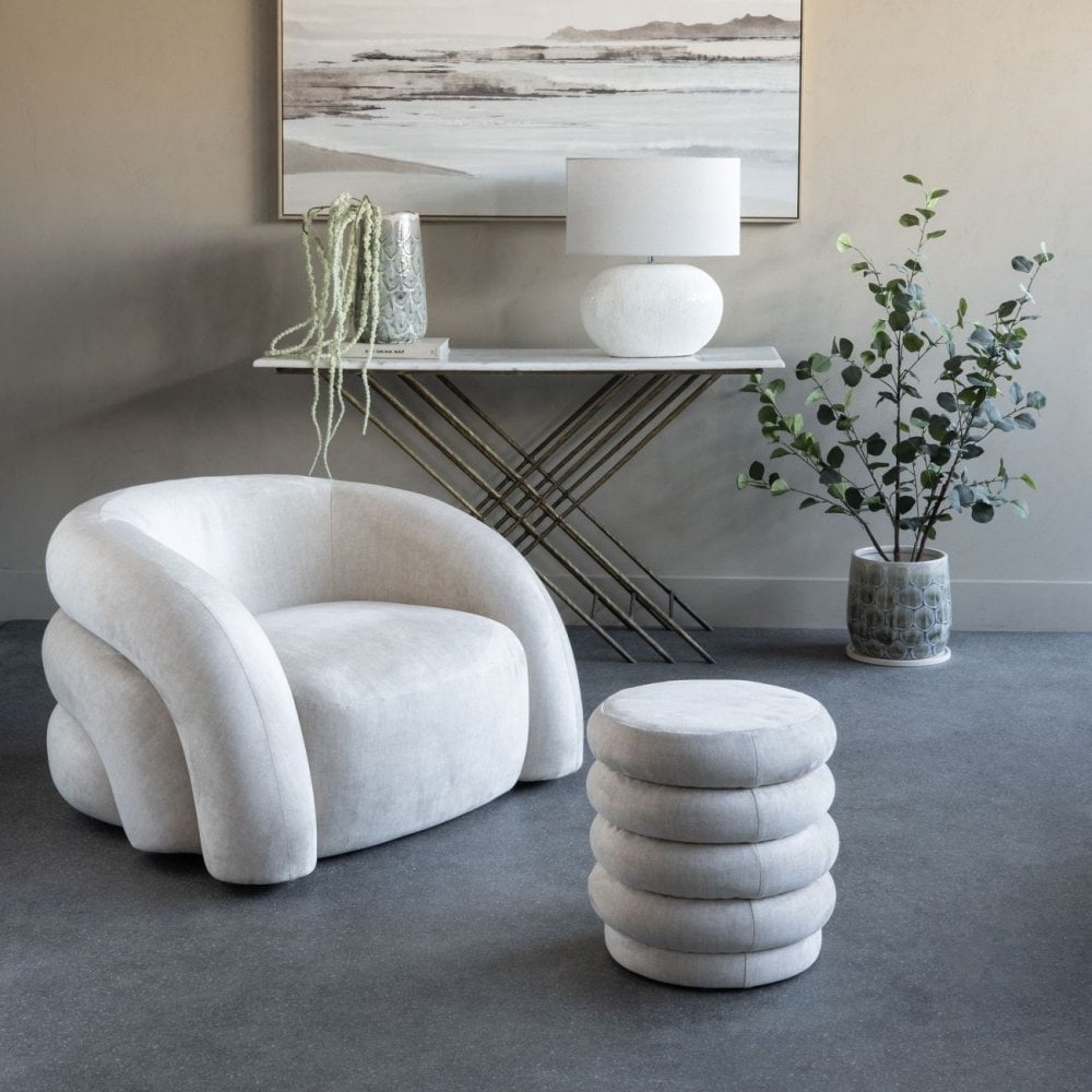 Measures W38 x D38 x H44cm. Explore the full Casa range, including a curved mini sofa, curved snug chair, two ottomans, storage bench, and a swivel chair—a comprehensive collection designed to elevate your living space with style and comfort.