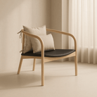 The Ikigae Lounge Chair brings a sculptural calm to contemporary interiors. Crafted from natural solid oak, the frame is grounded yet fluid — defined by its low profile, curved raised rim, and subtly recessed angular legs. Each element is precisely proportioned, creating a visual rhythm that feels deliberate and beautifully resolved.