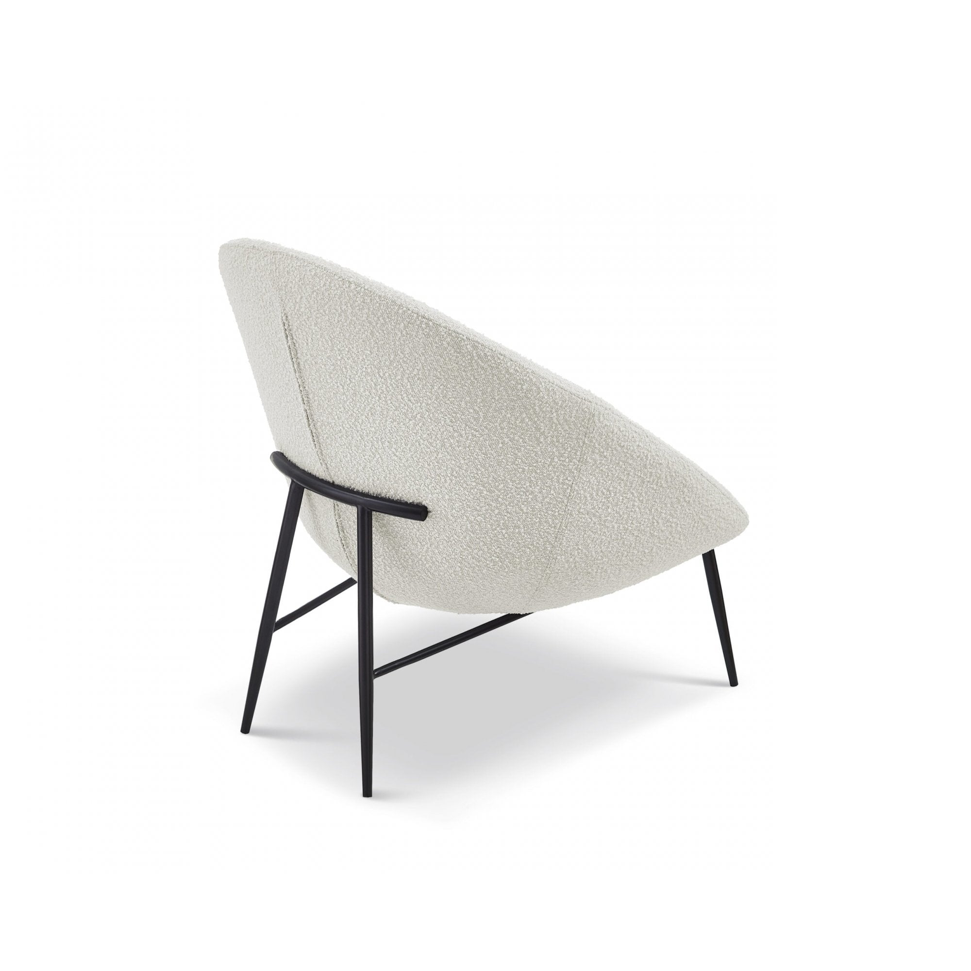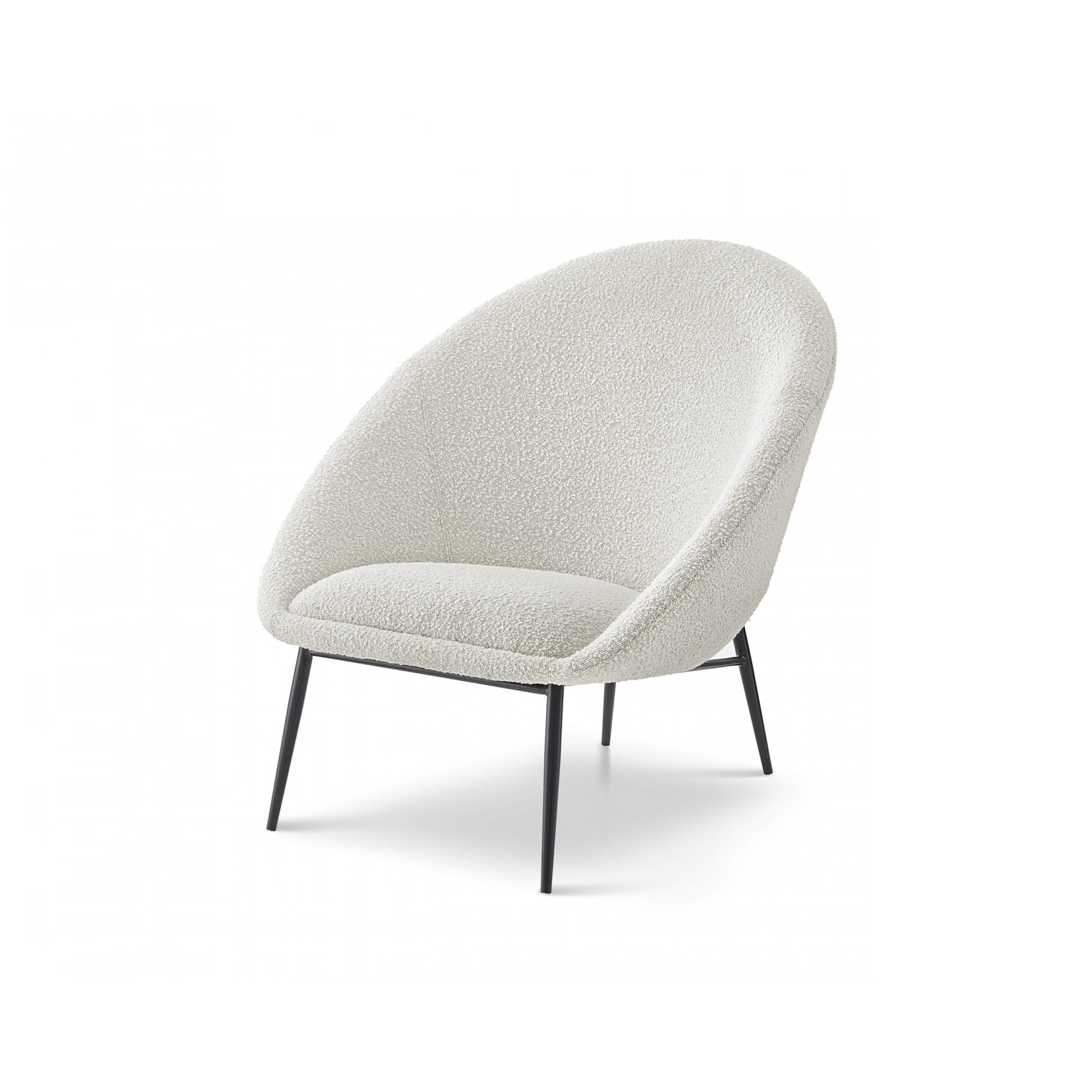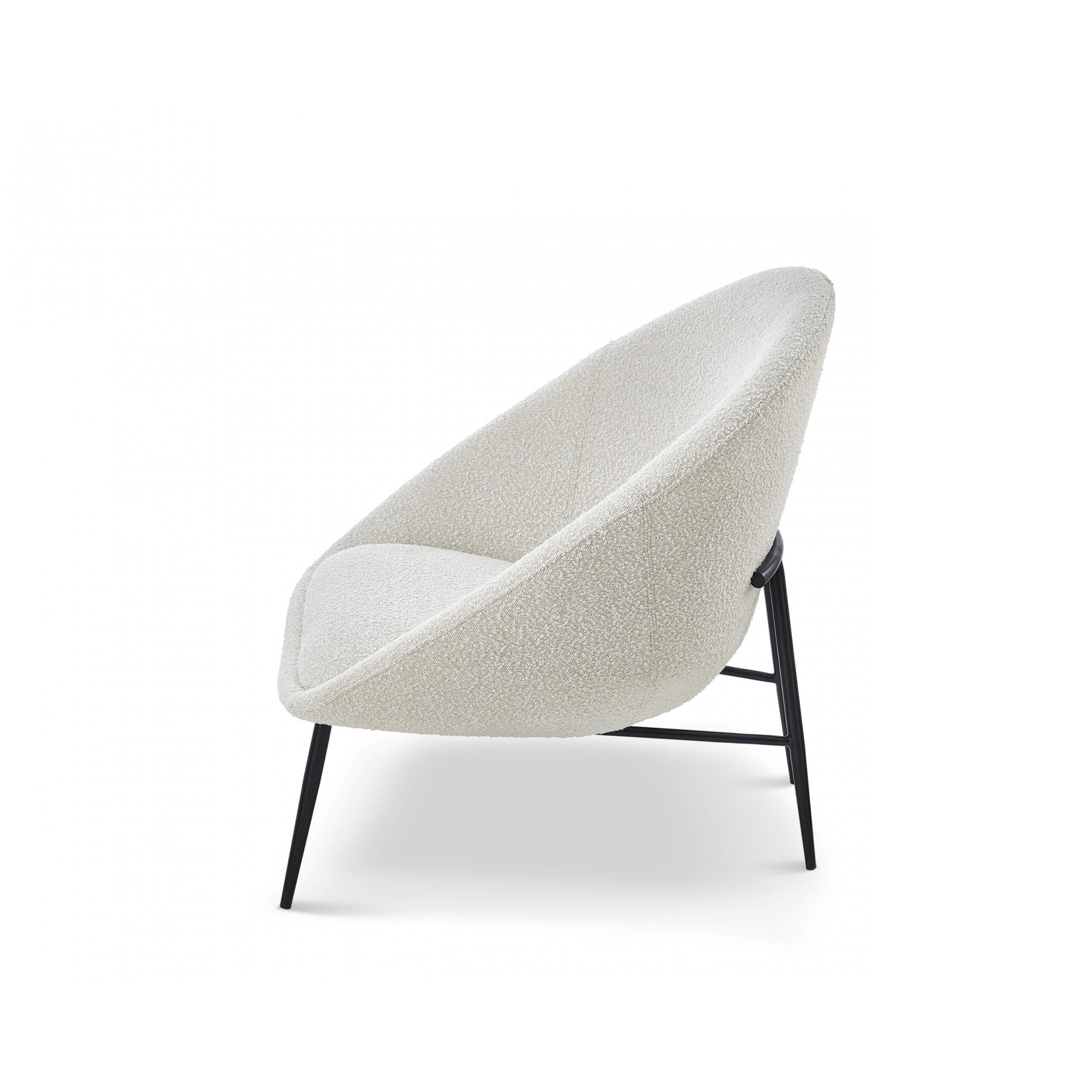 Experience comfort and style with the Ovalo Occasional Chair, upholstered in luxurious boucle sand fabric. This chair boasts a stylish enveloping silhouette and sleek matte black-coated steel legs, exuding mid-century flair. Perfect for elevating any living space or hospitality venue, it invites relaxation while enhancing decor.