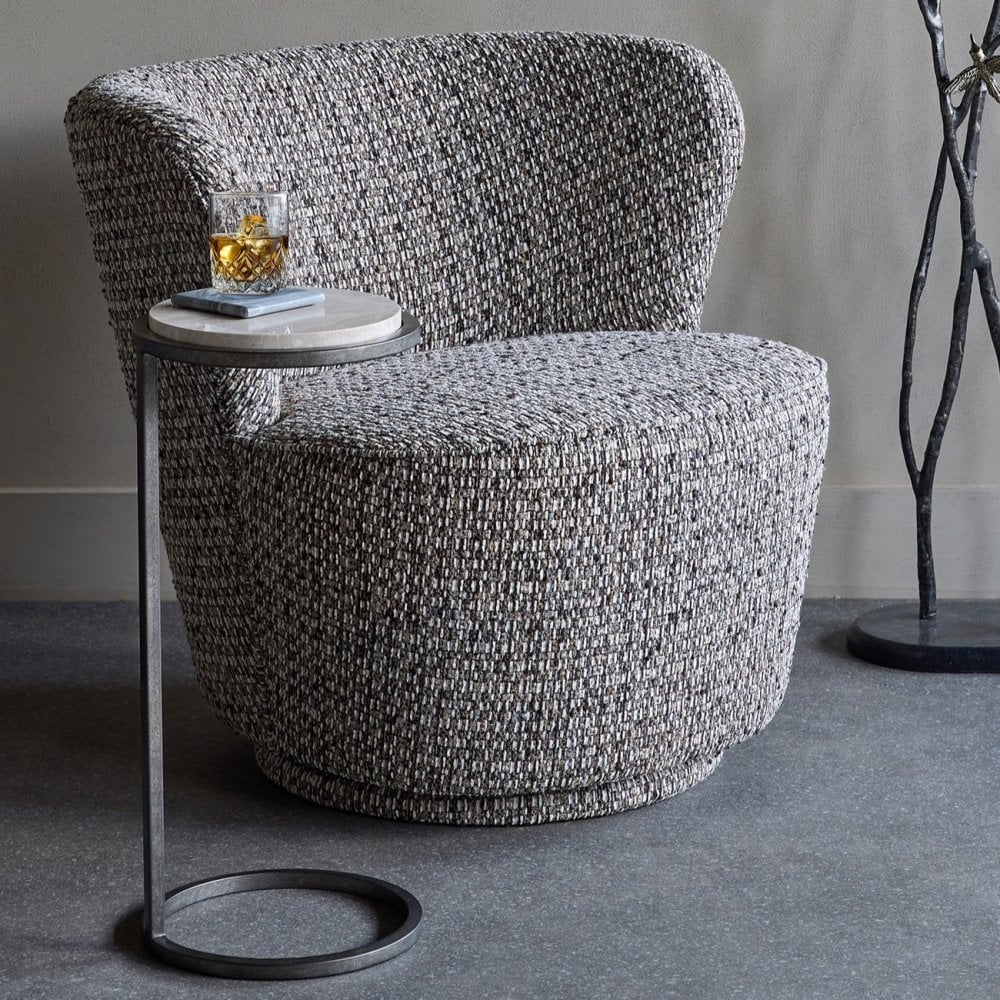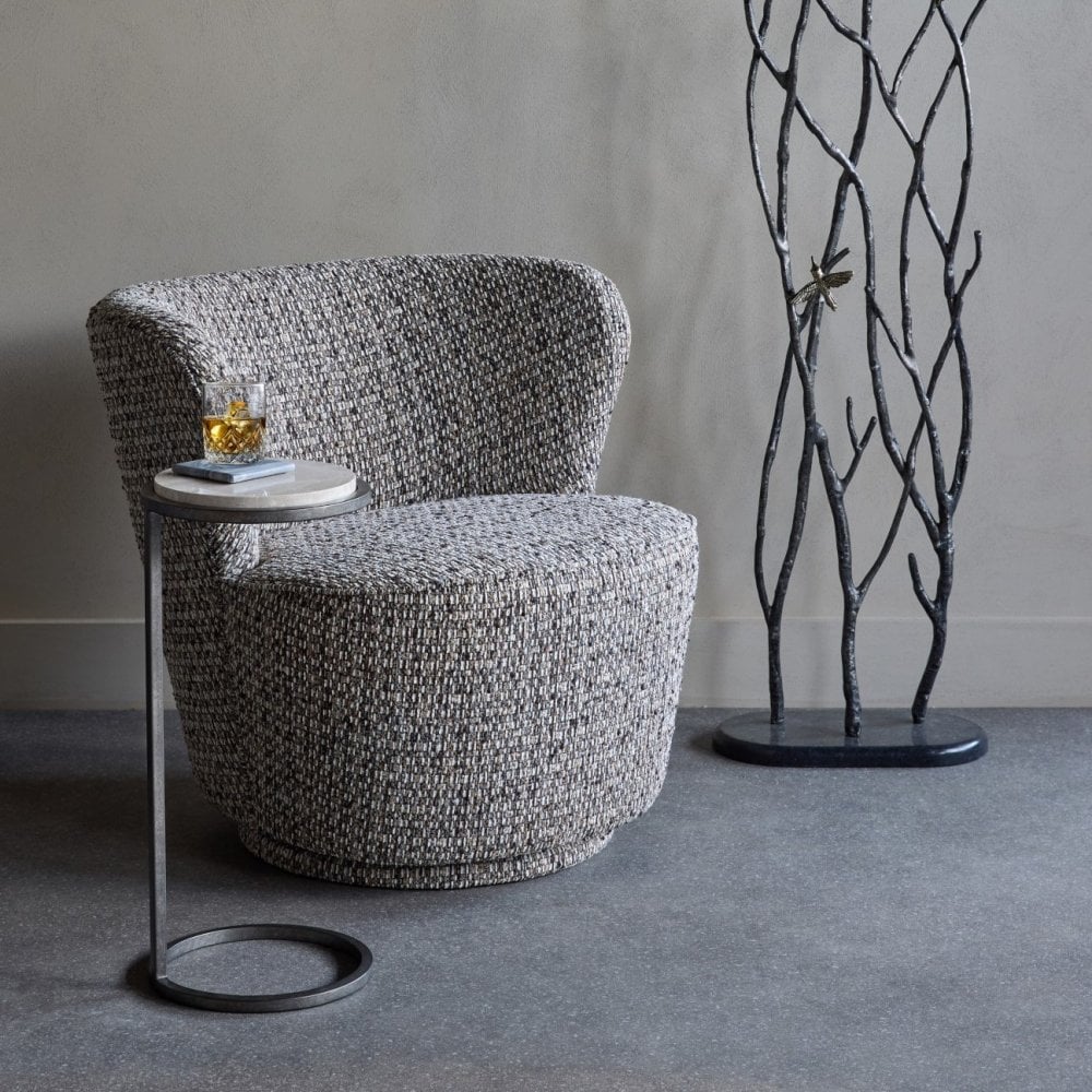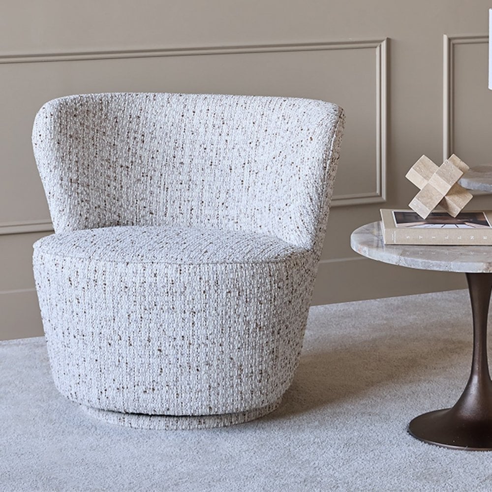With its gently rounded silhouette and richly textured fabric, the Roehampton Swivel Chair brings quiet luxury to any corner. Upholstered in a soft flecked weave that blends mocha, cream, and chestnut tones, this compact piece delivers both comfort and contemporary character. A discreet swivel base offers smooth rotation, while the low back and subtle wrap-around shape create an inviting seat that feels both supportive and sculptural. Roehampton is perfectly sized for bedrooms, dressing spaces or cosy living zones in need of a refined accent. Also available in a lighter Natural colourway.