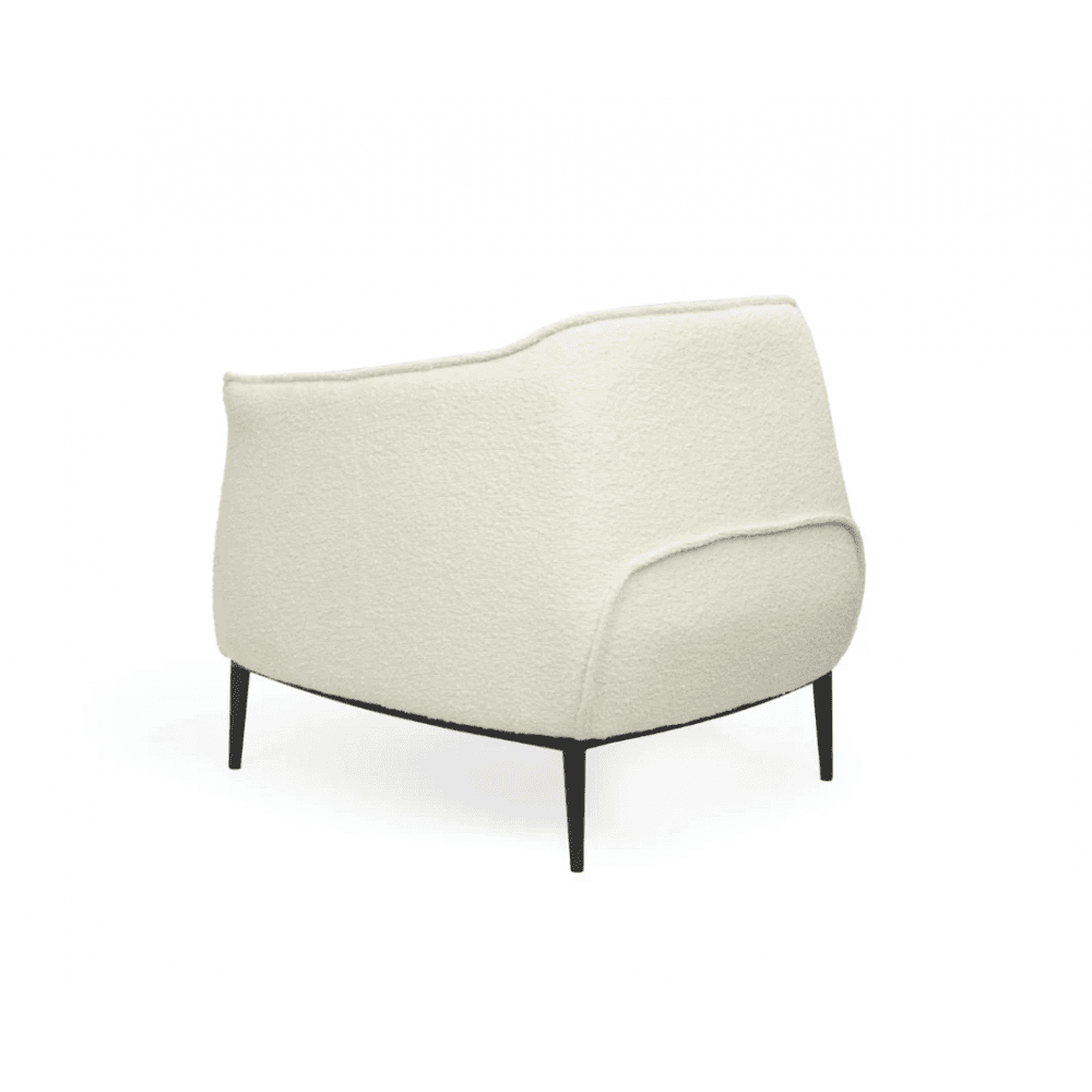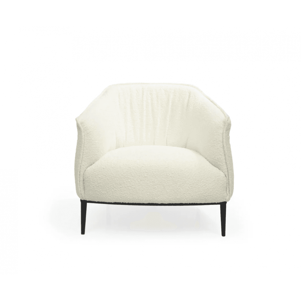The Tyrone Lounge Chair is the perfect invitation to relax and unwind, offering a comfortable retreat for cosy moments with a good book. Upholstered in beautiful Chex Bouclé Polar, it exudes a chic and sophisticated charm, enhanced by the elegant ruching fabric detail that adds texture and interest. The chair's contrasting black metal legs provide a modern edge, blending seamlessly with its inviting design to create a stylish and comfortable haven in any room.