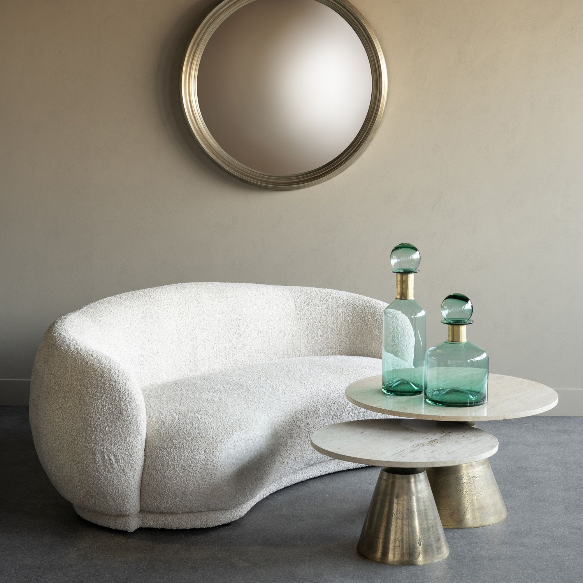 Revamp your living space with the Waverley Seater Curved Mini Sofa in Cream from Libra Interiors. This sofa seamlessly blends modern luxury with timeless elegance. Featuring a smooth, curved supportive frame, it offers the perfect mix of style and comfort. The chic boucle texture adds sophistication, making it a stunning focal point in any room.