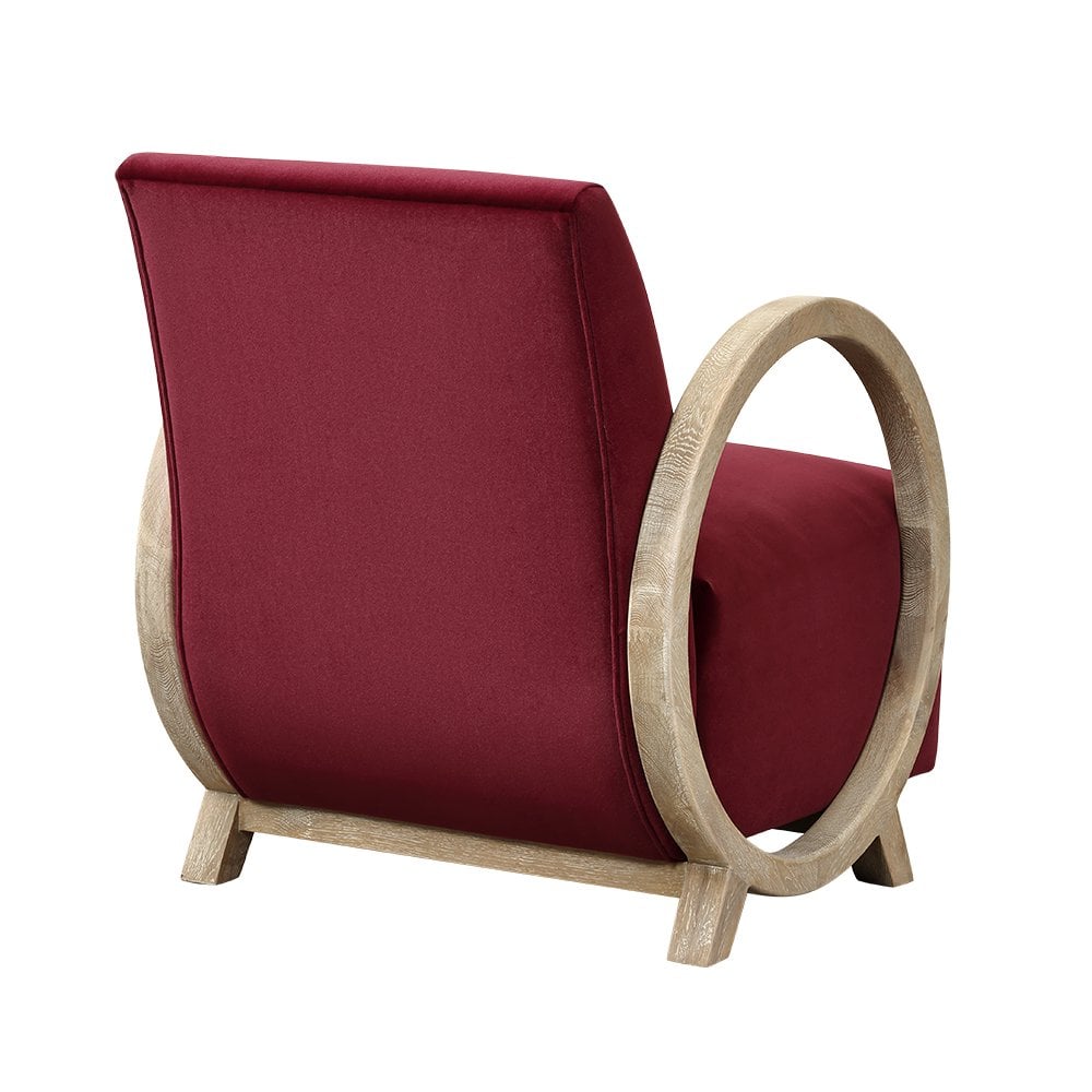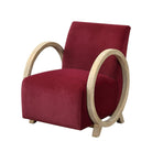 Upholstered club chair in plum fabric with oak circular arms and legs.