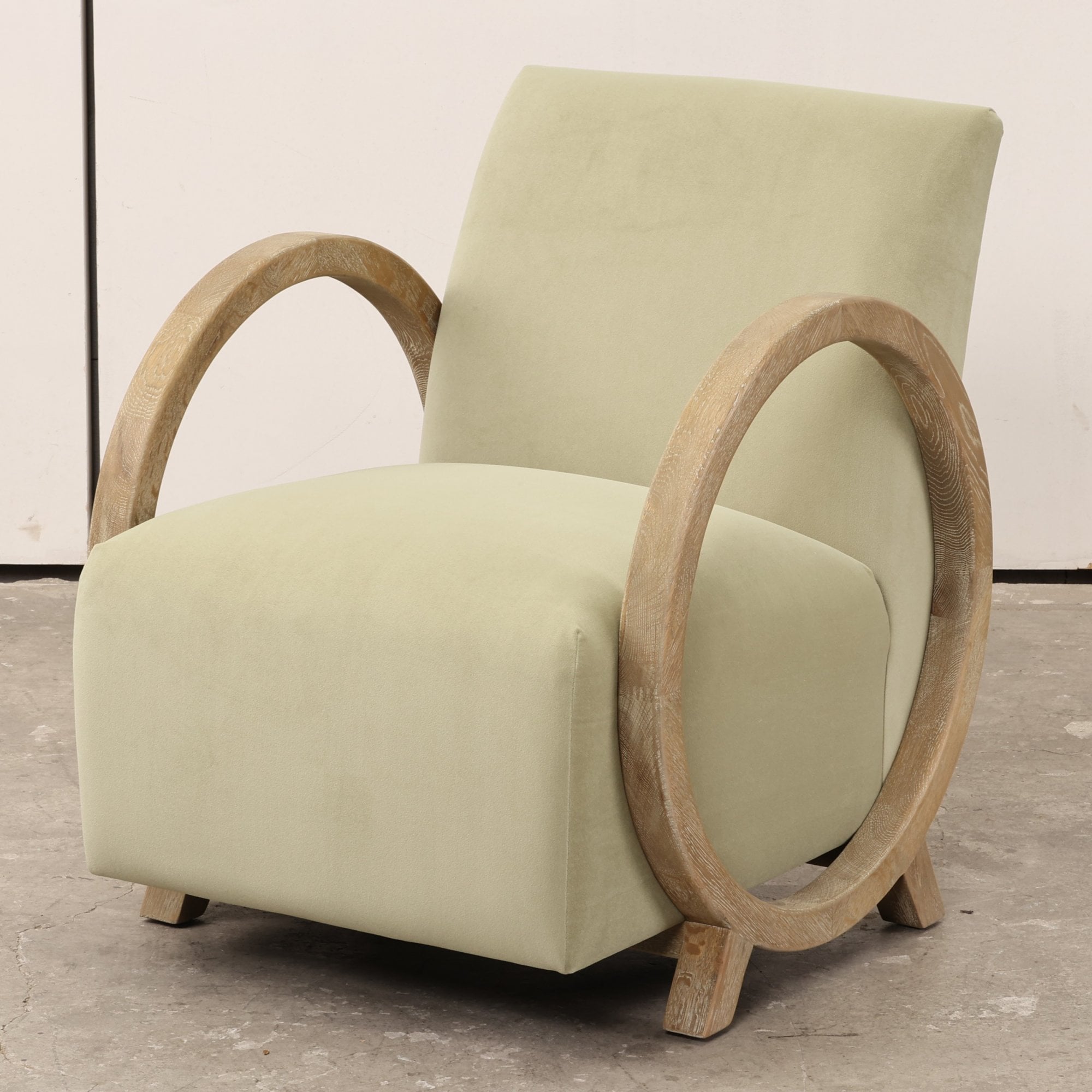 Upholstered club chair in sage green fabric with oak circular arms and legs.