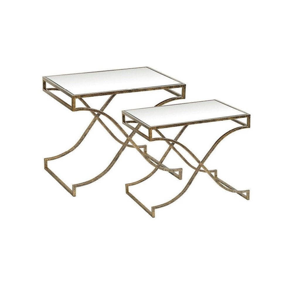 Madison Tables, art deco in style, two tiered tables suited to sit beside one another. Champagne gold colour in finish, mirrored top.