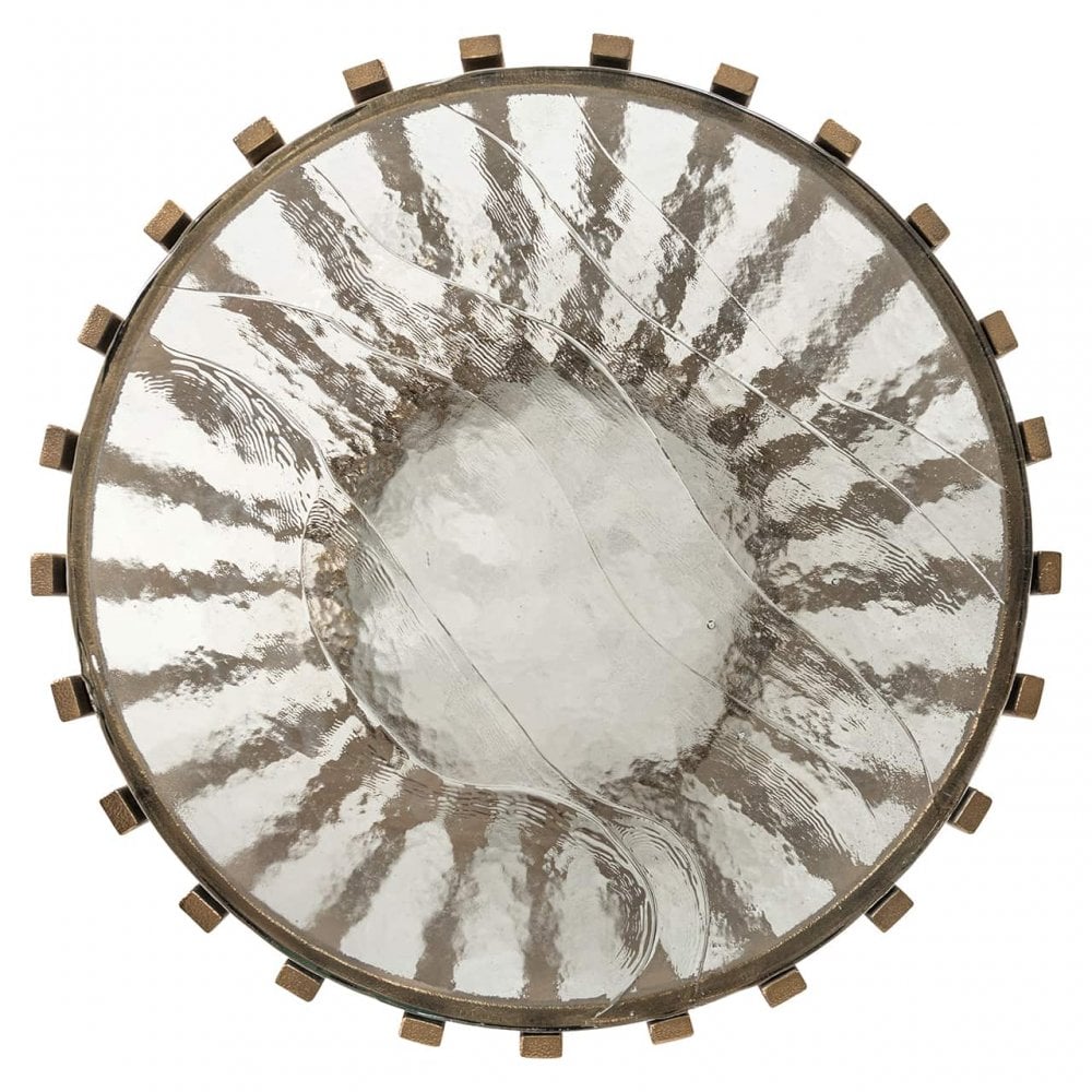 This piece stands out with its distinctive base, featuring rounded, tapered iron bars finished in antique brass. The circular textured glass top creates a striking contrast, ideal for displaying cherished items or keeping essentials easily accessible.