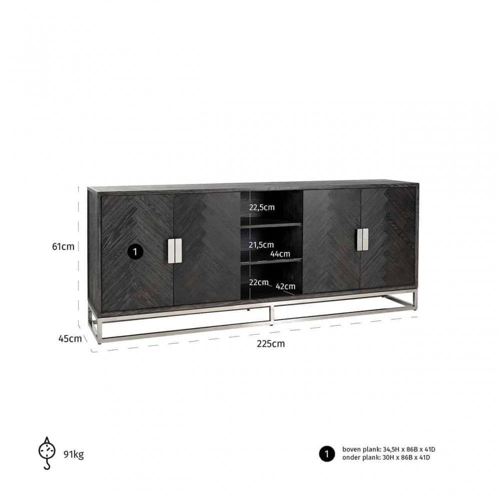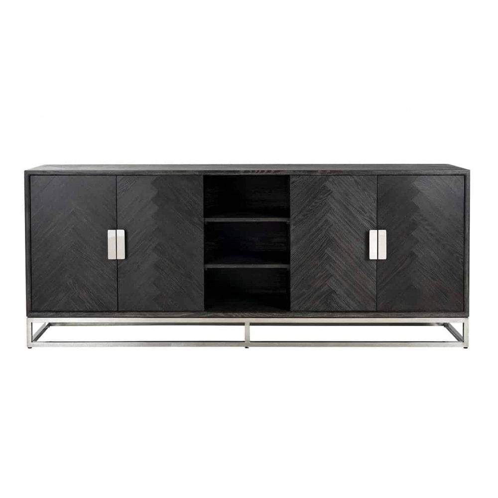 Our expansive Blackbone collection showcases exemplary contemporary furniture, featuring black oak timber arranged in a captivating herringbone pattern, perfectly complemented by a variety of stylish metal accents. This trendy sideboard is built with a robust stainless steel frame in a gleaming silver finish, offering four doors for concealed storage and two open shelves ideal for displaying decorative pieces.