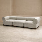 Demure Sofa is a study in restrained elegance, where generous proportions meet softly sculpted lines. Upholstered in textured Nordic Sand, its curved arms and deep, inviting seats create a cocooning silhouette, while the Mid Brown timber base introduces warmth and architectural grounding. Designed to anchor refined residential interiors and elevated hospitality spaces alike, Demure delivers comfort with quiet confidence and timeless appeal.
