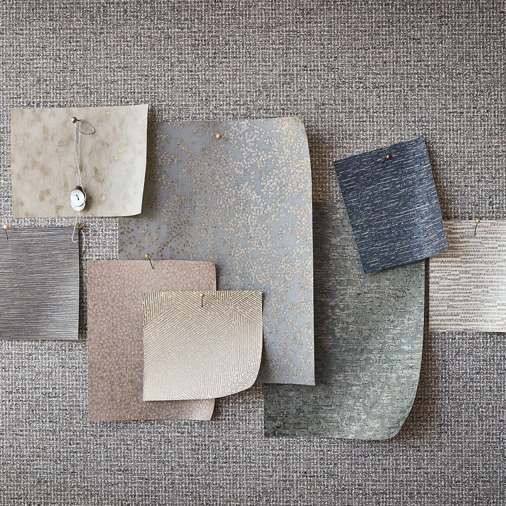 A stylish collection of understated semi-plain wallcoverings that offers a usable compendium of must have designs. Intricate details are elevated by glimmers of luxe metallics and fine textures that add an unexpected element of design. Unique embosses add depth and dimension, while a refined palette of soft shades and rich metallic tones display another layer of luxury and sophistication.