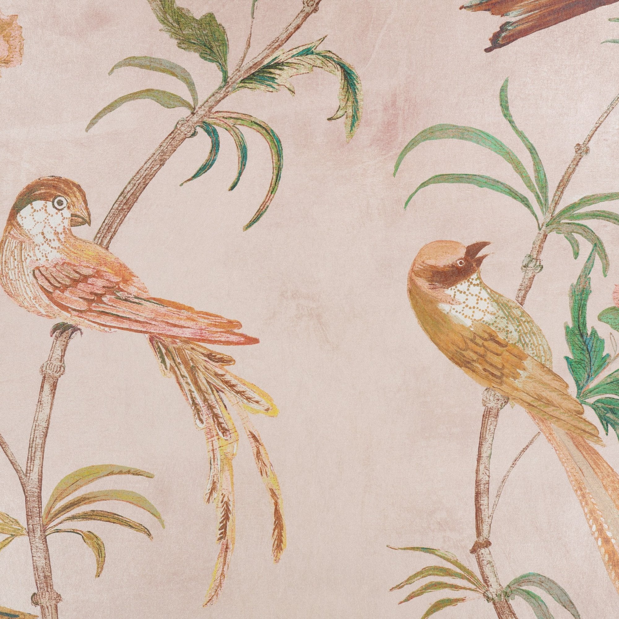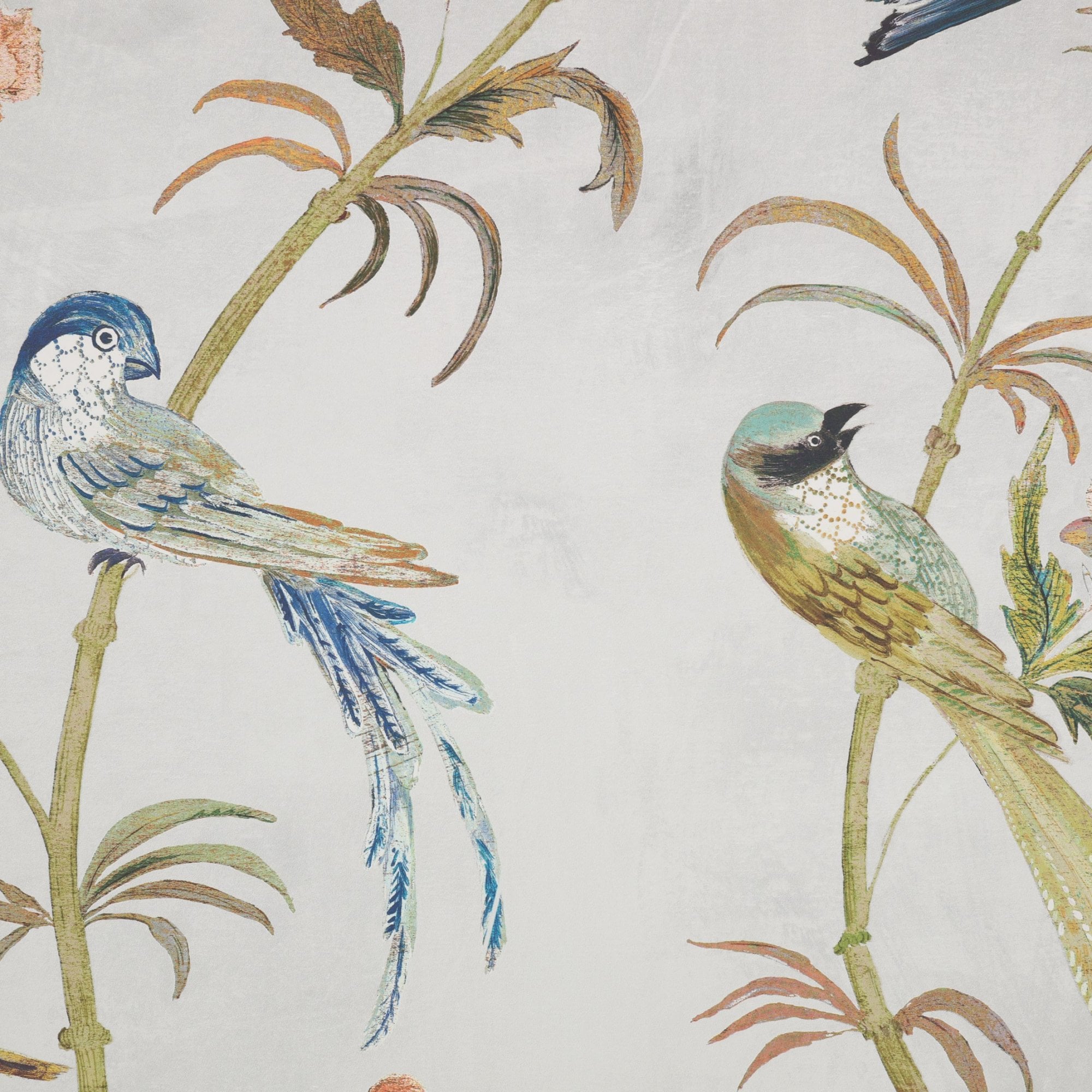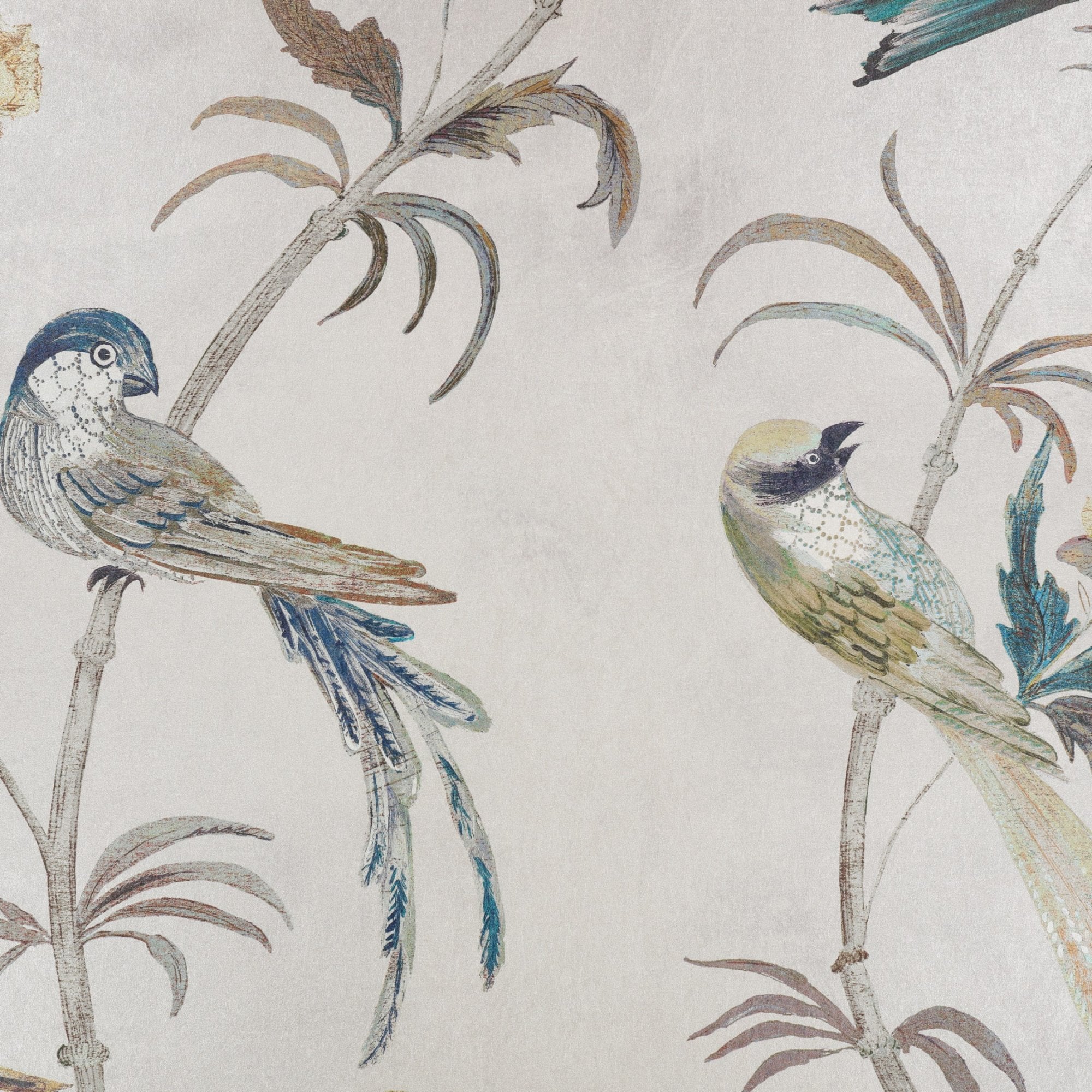 Perched on delicate branches, an uplifting spectacle of graceful birds transport you to a tropical aviary of colour and texture. Printed on both matt and pearlescent grounds, in a rich palette of deep tones, decadence and desirability are in abundance.