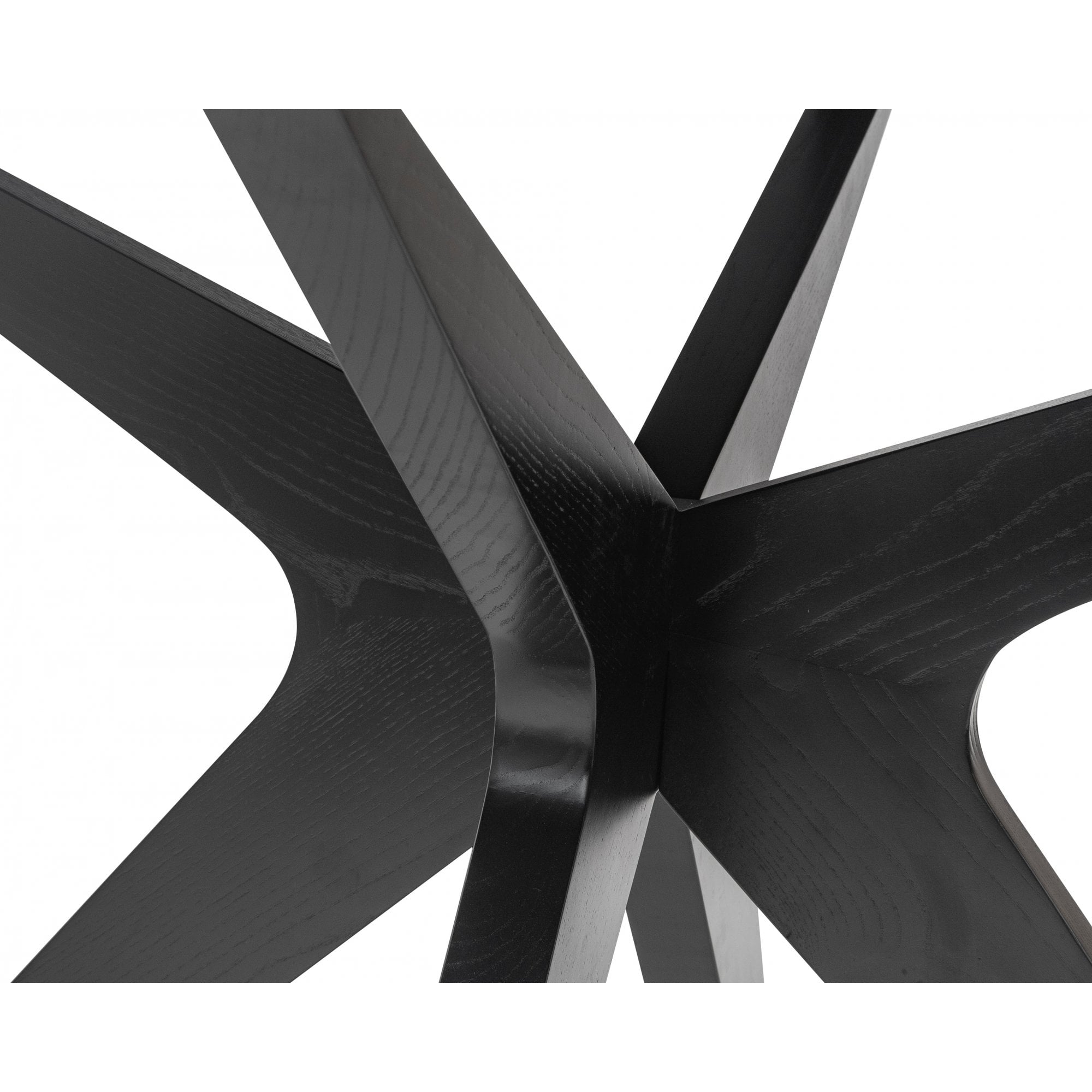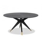 The Anthology Dining Table D1500 is a striking mid-century design, featuring a circular top with a subtle quartered pattern. Made from Wenge finished oak veneers and polished brass cappings, it boasts a statement base of slender spokes. Perfect for both classic and contemporary chic spaces.