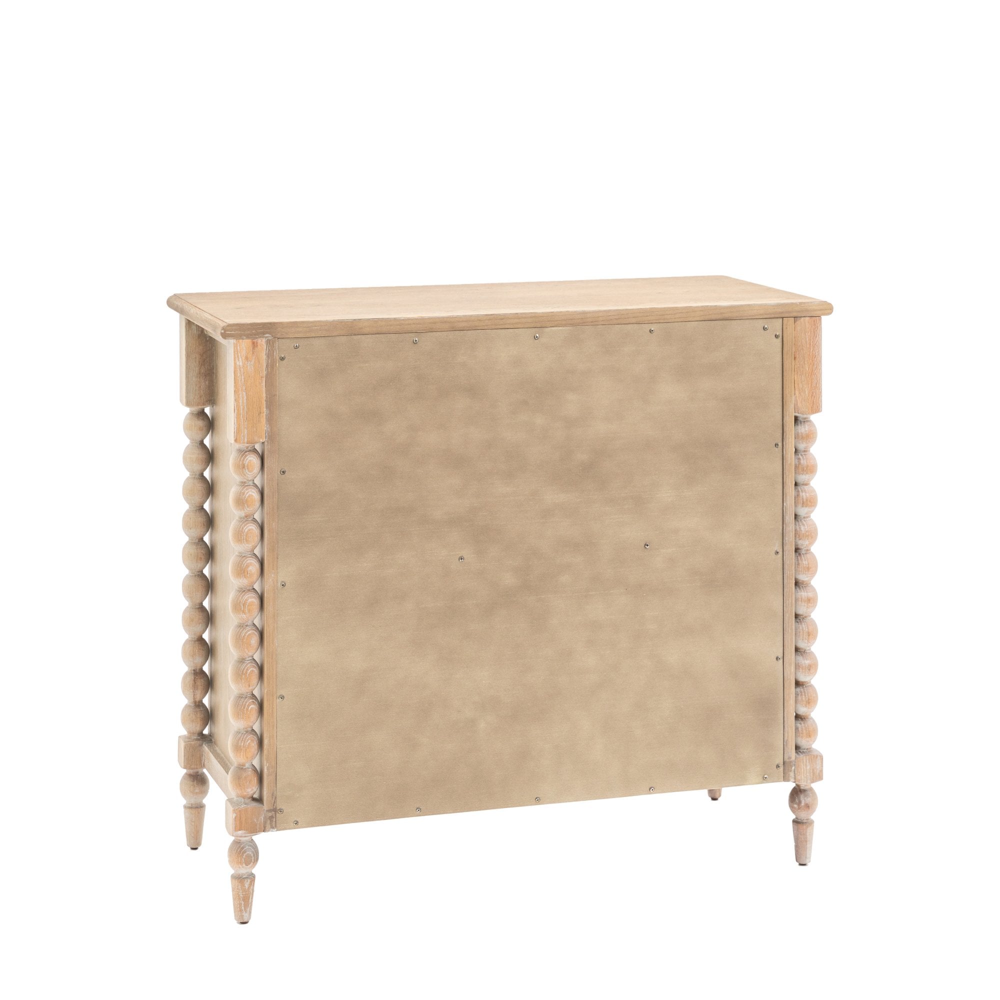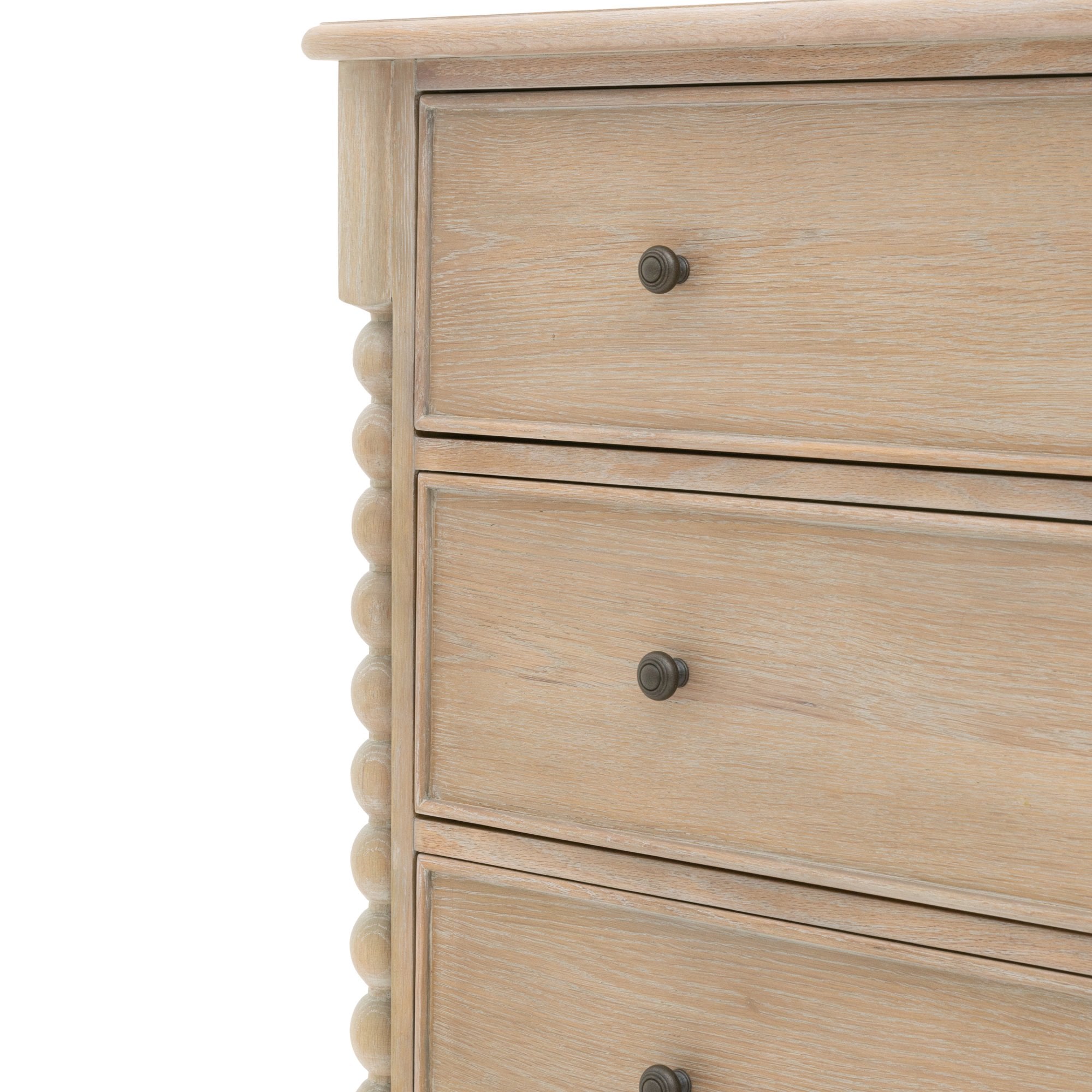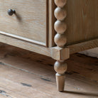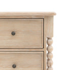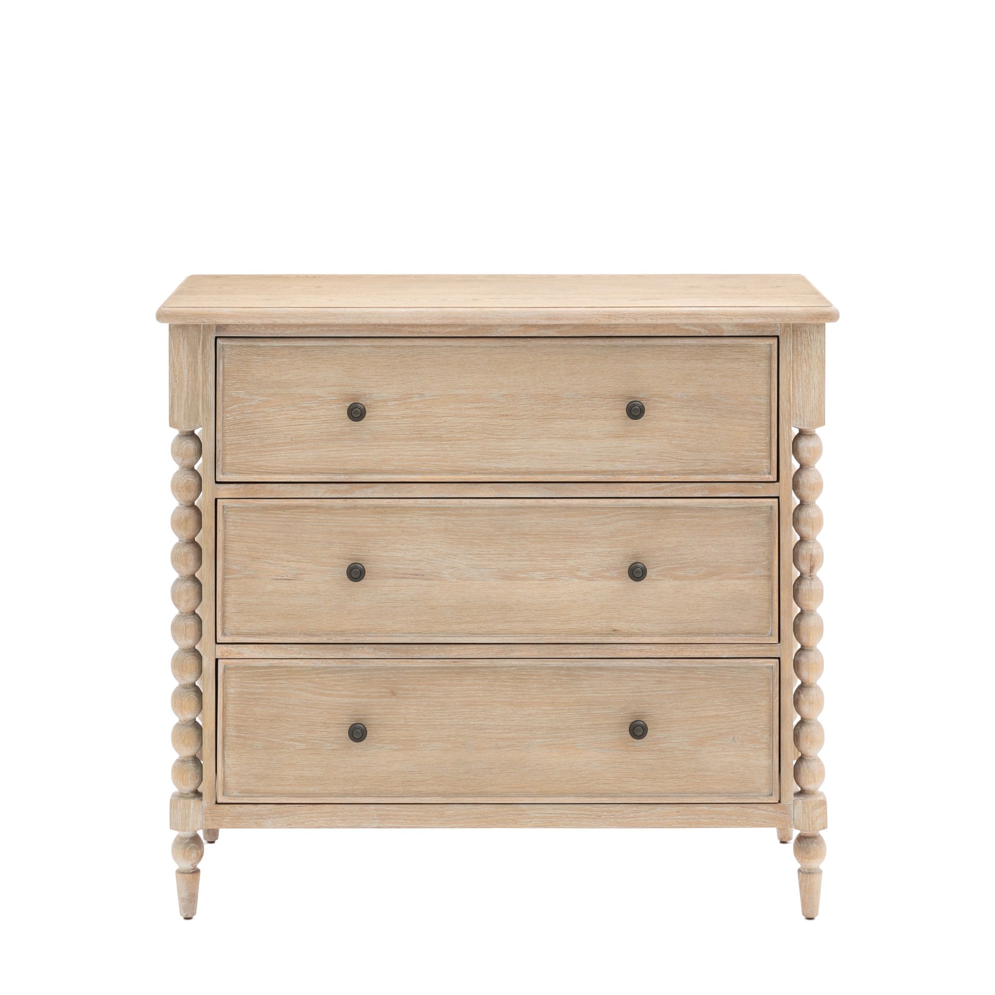 This 3 drawer chest provides a refined storage option with its timeless design and expert craftsmanship. Featuring hand-turned bobbin detailing and a lime-wash oak finish, this chest blends durability and sophistication. The three spacious drawers are ideal for organizing and storing household essentials with ease.