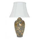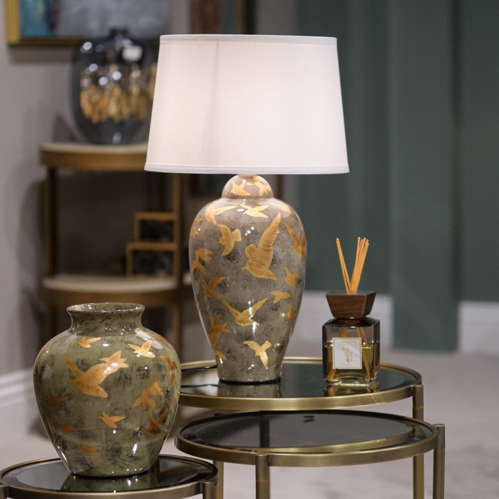 Good lighting is essential for every home. Our ceramic collection is traditional yet timeless and featuring stunning designs, prints and patterns bursting with colour. This lamp is charcoal grey in colour with a gold leaf oriental bird pattern. White linen shade.