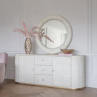 The Aspen Round Mirror is a captivating mirror made in bone to stand alone or sit proudly over our Aspen cabinet. The mirror’s sturdy rounded frame is made entirely in beautiful intricate bone inlay, which has a lustrous quality reminiscent of mother of pearl. Perfectly balanced in both form and function, the Aspen Round Mirror brings an air of refinement to any interior. Due to its weight and size, the item should be installed by a professional.
