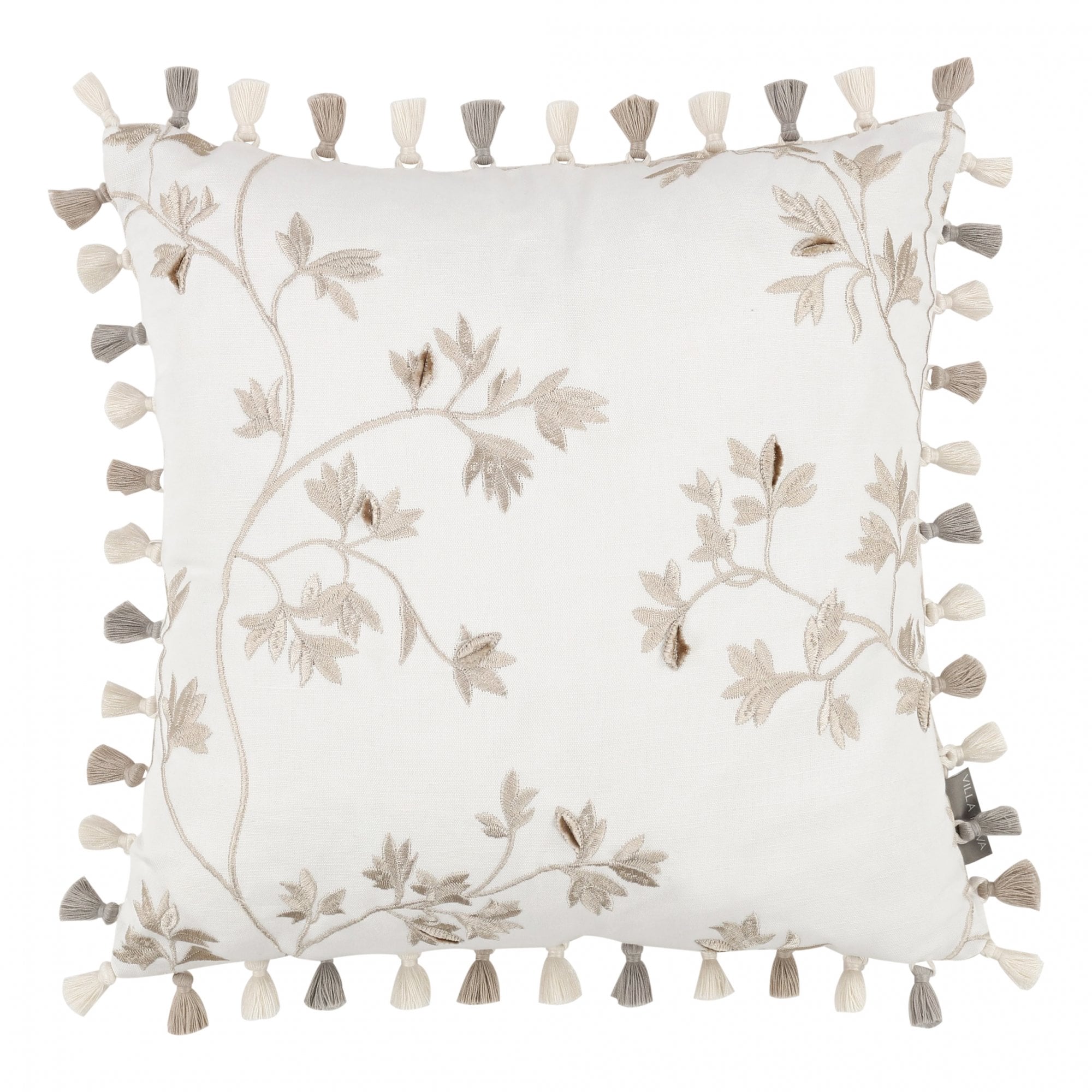 Featuring a rambling leaf embroidery design, this elegant cushion is backed in coordinating velvet and finished with a charming tufty braid, providing a desirable, modern twist.