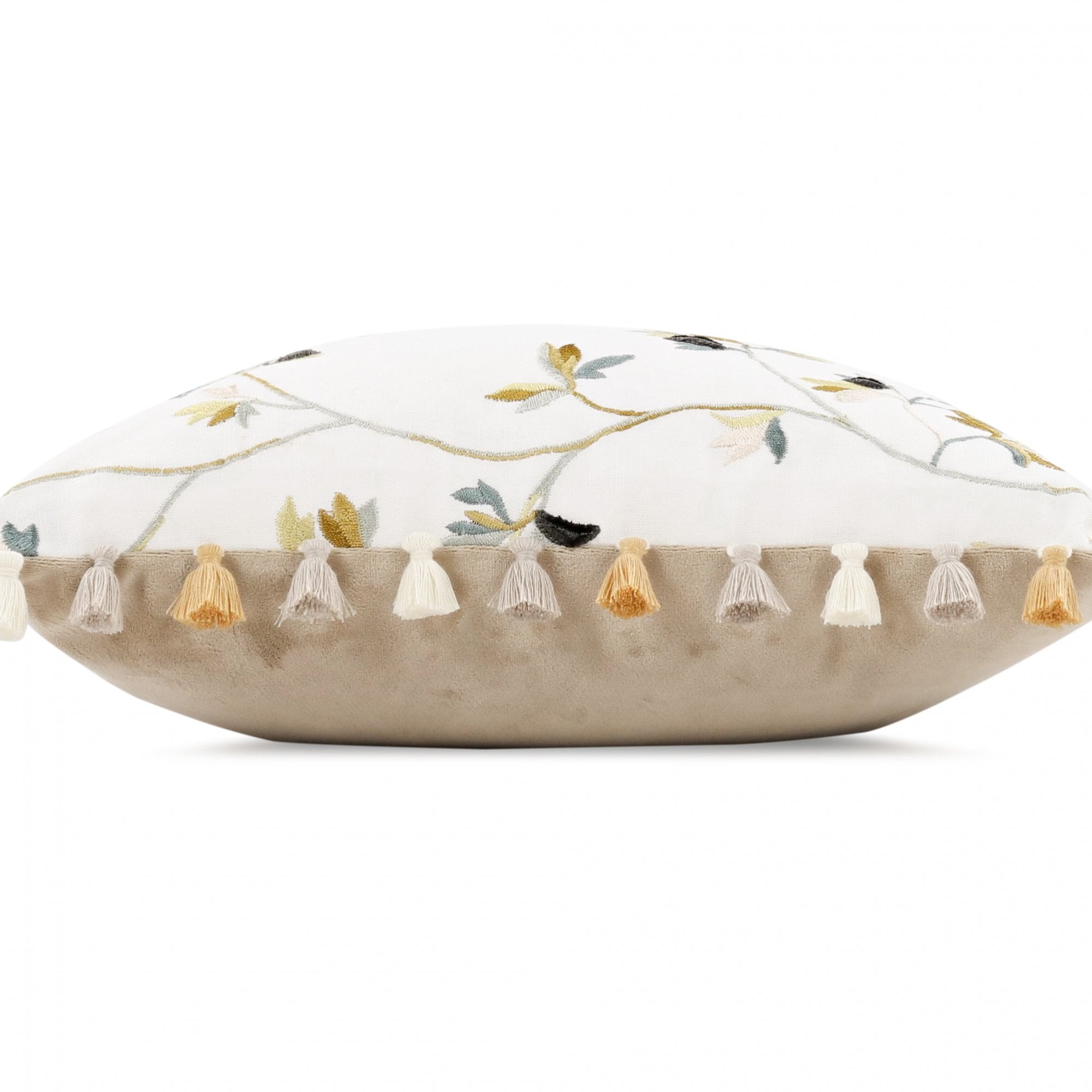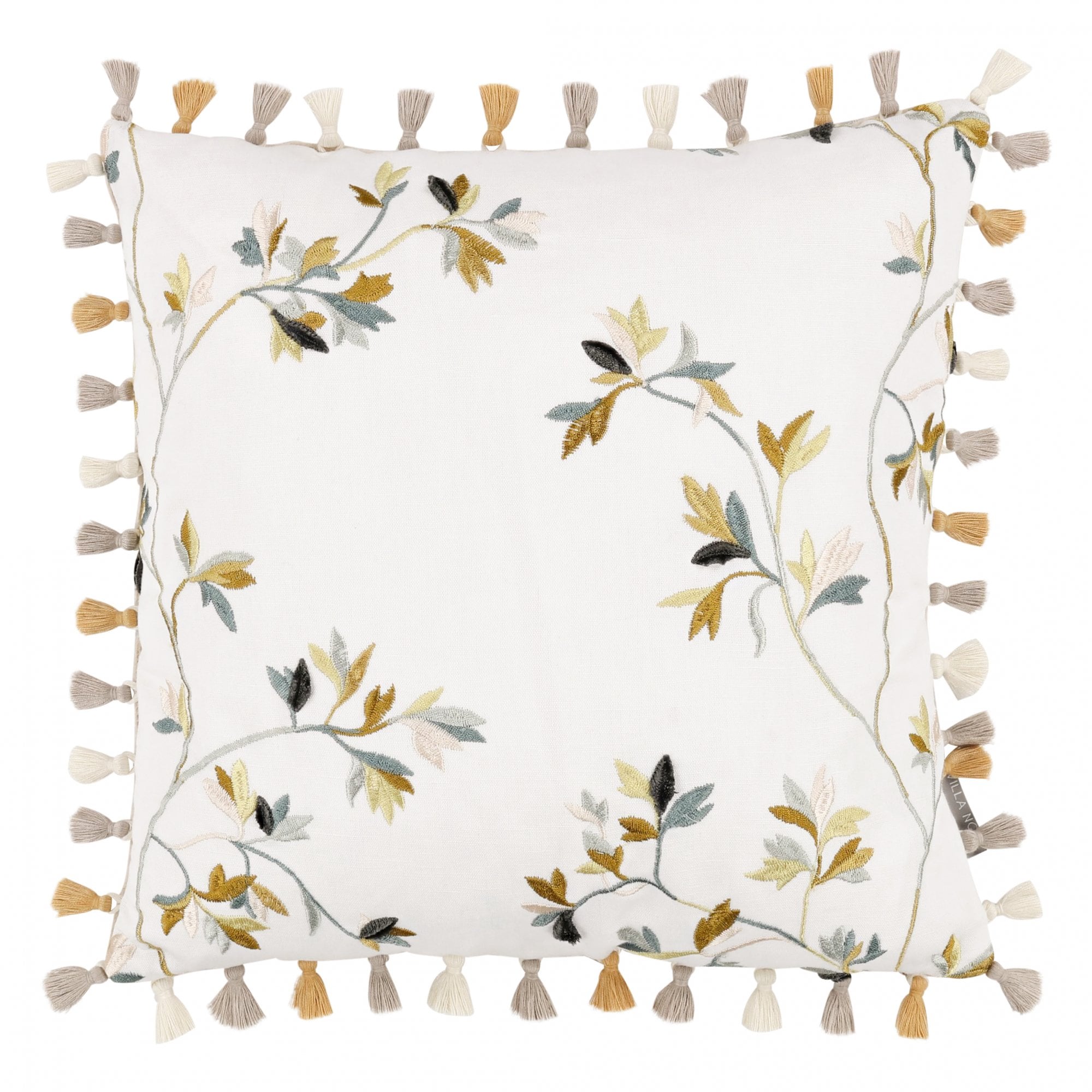 Featuring a rambling leaf embroidery design, this elegant cushion is backed in coordinating velvet and finished with a charming tufty braid, providing a desirable, modern twist.