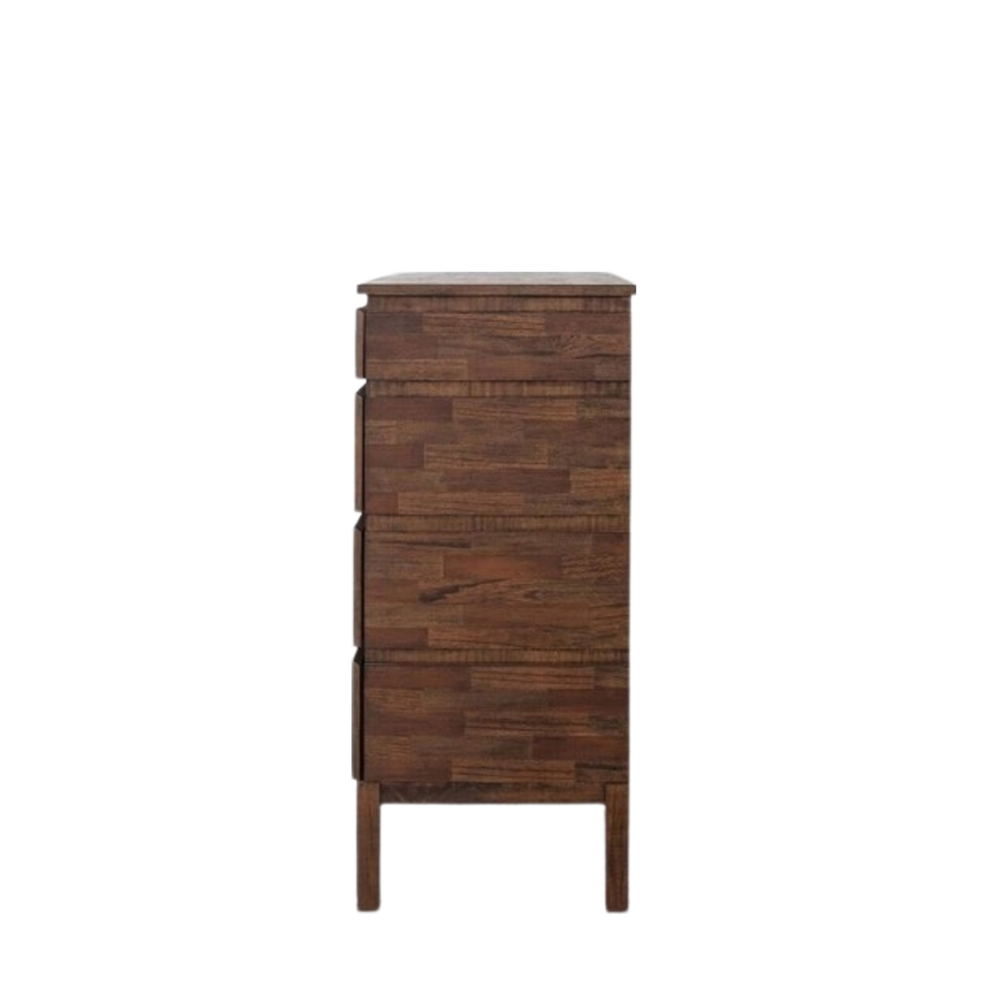 This 4 Drawer Chest is made using Mango solids with mixed timber veneers of Teak-Mahogany-Mindy Ash and Mango which give contrast and make the inlaid pattern stand out. It has a stunning mat black charcoal finish - the different grains in the mixed timbers stand out in the light and catch your eye with this beautiful detail.