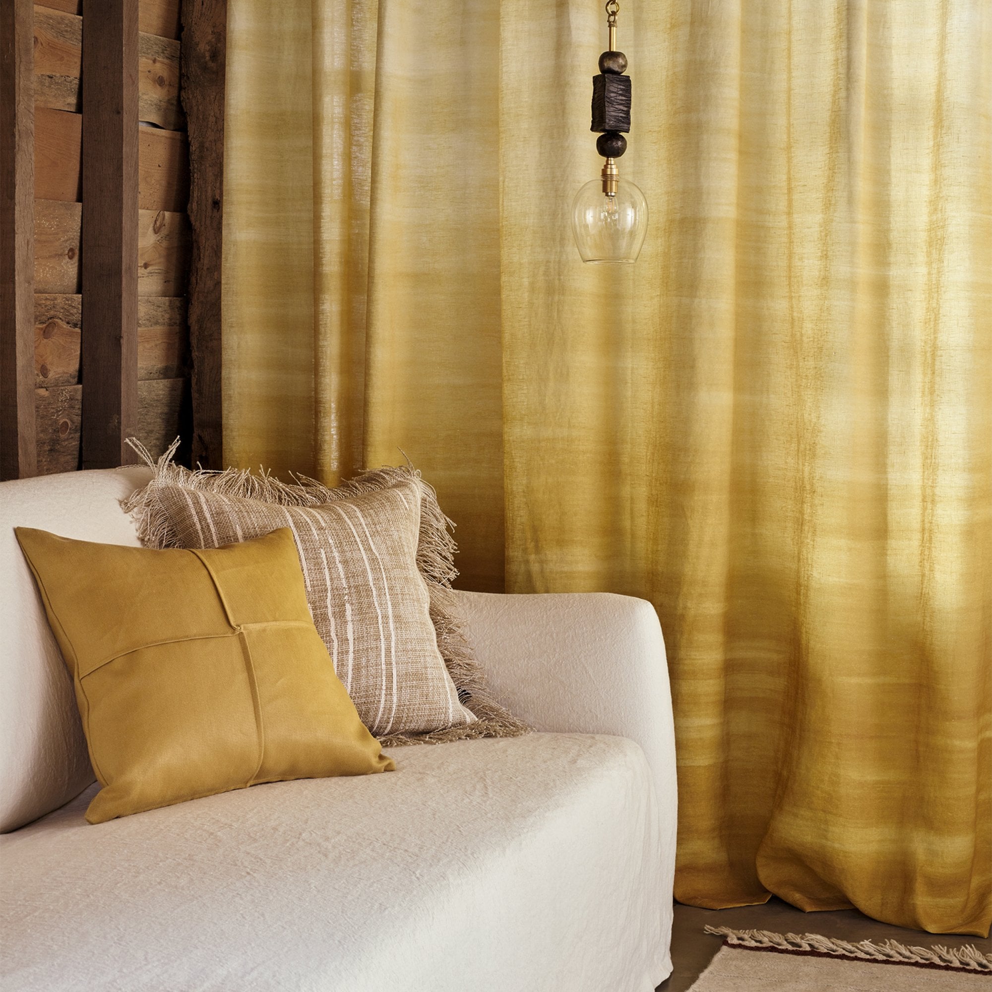 Impactful and modest, this stunning cushion features a naïve linear design screen printed on a course, open jute weave and finished with an organic frayed edge.