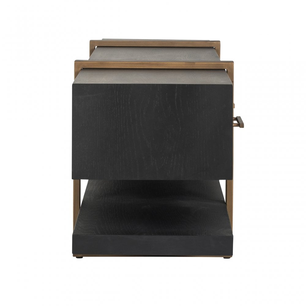 Made of oak wood and a metal frame, this TV-unit is finished with dark coffee oak veneer and metal details, and features 3 drawers for storage. The sleek and elegant design adds a luxurious look to your living area.