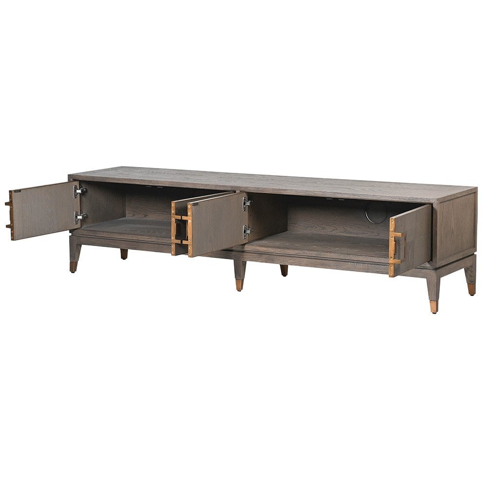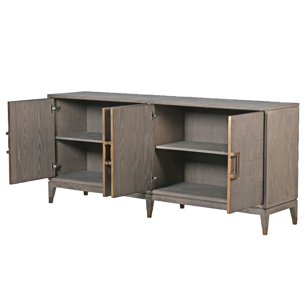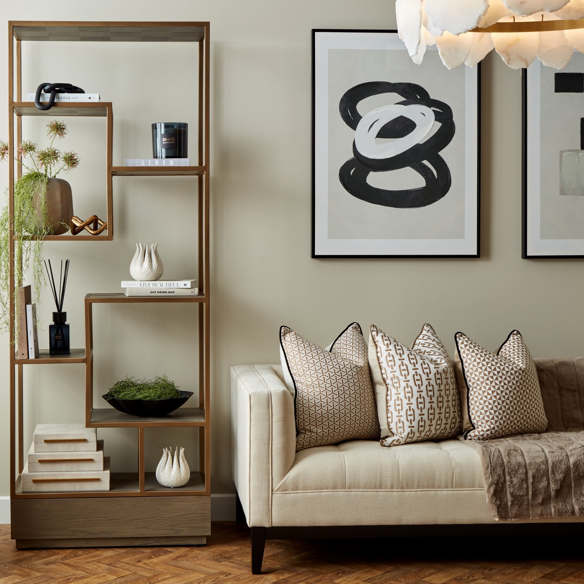 The Carter Narrow Multi-shelf Display Unit is a sleek and modern furniture piece constructed from textured grain oak. It boasts refined brass handles and intricate brass inlay accents, elevating its overall aesthetics. This display unit offers versatile storage and display options with multiple shelves, making it a practical and elegant choice for showcasing your favorite items while adding a touch of sophistication to your space. Style with designer coffee table books, accessories and faux florals to create an eye catching point of interest to your interior space.
