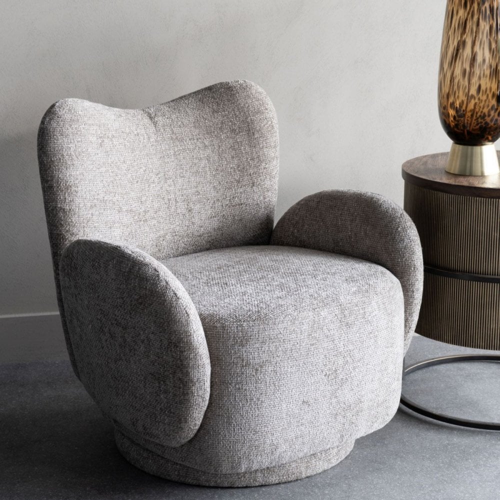 Experience comfort with the Casa Upholstered Swivel Chair in Mink, and explore the full Casa range in various colors, including a curved mini sofa, curved snug chair, stool, ottoman, and storage bench.
