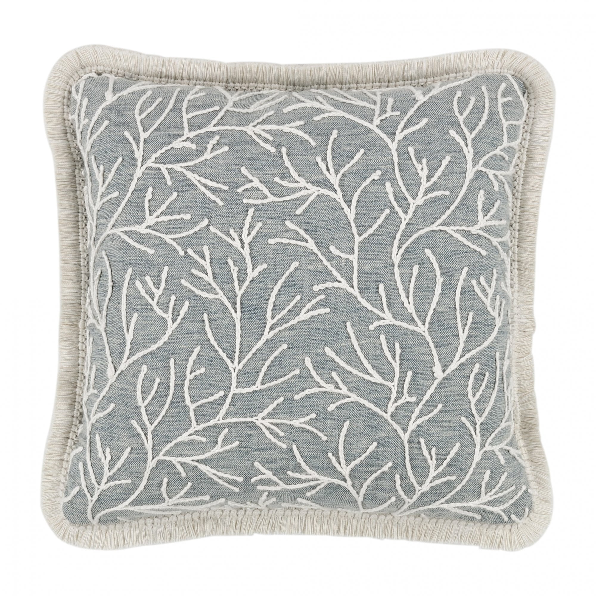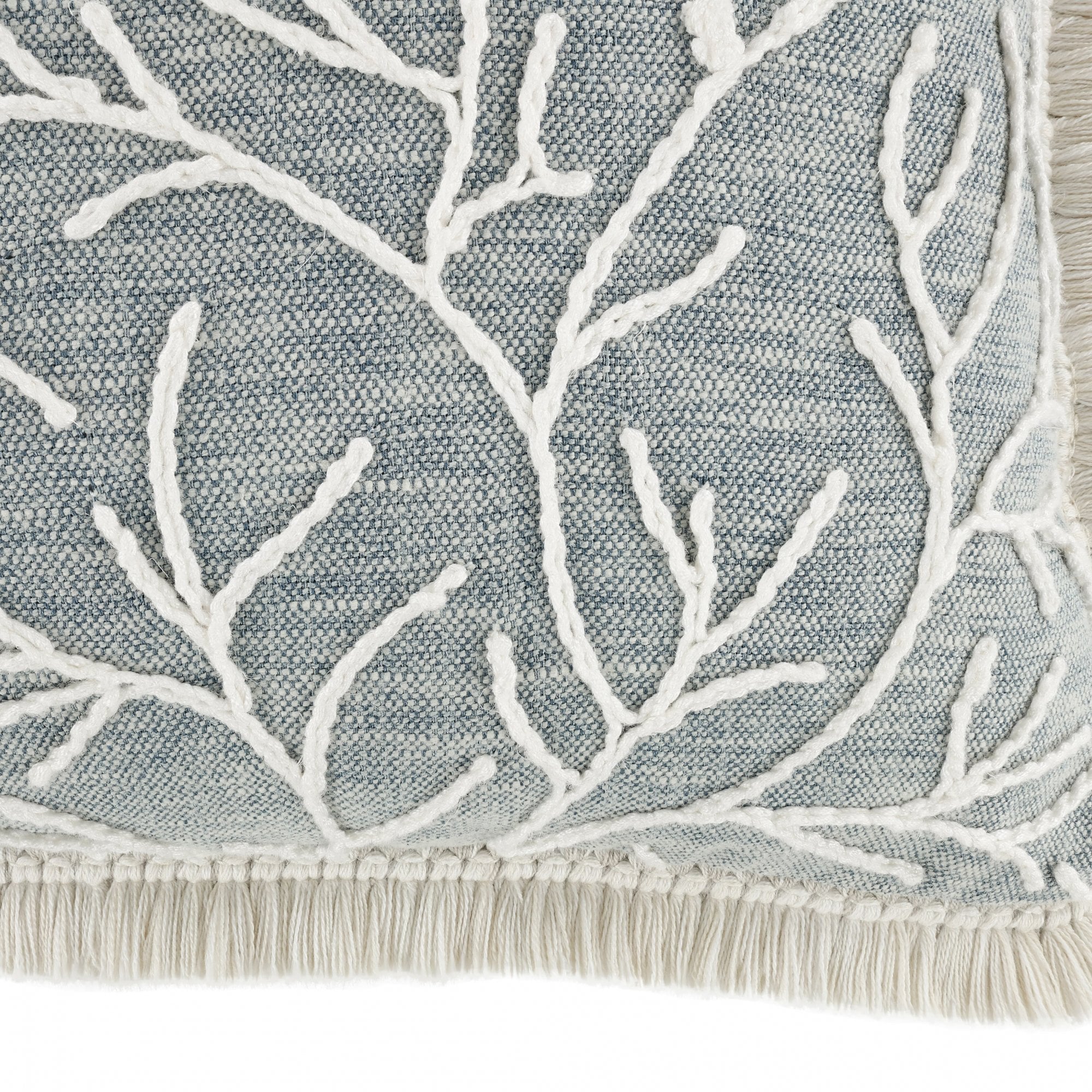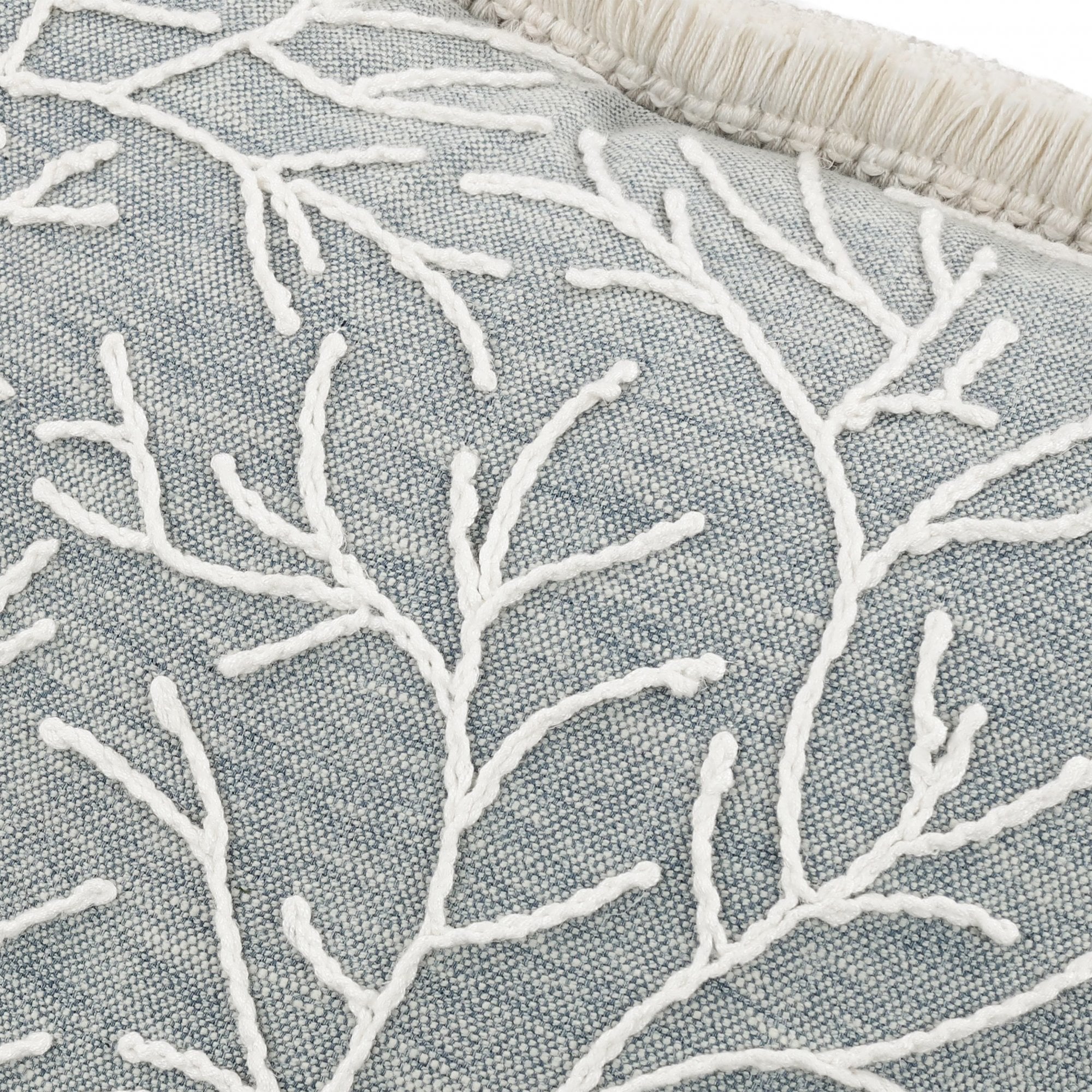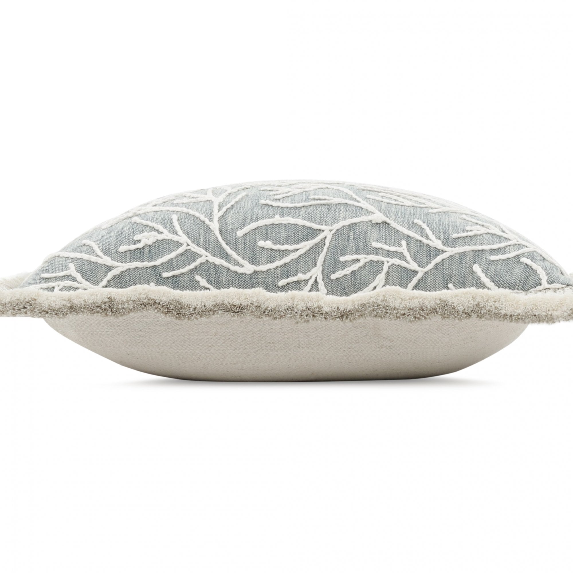 A creative cushion; corded embroidery outlines sprawling fronds on top of a softly textured cloth. An added textual detail, a stunning two-tone ruche borders this eye-catching readymade cushion.