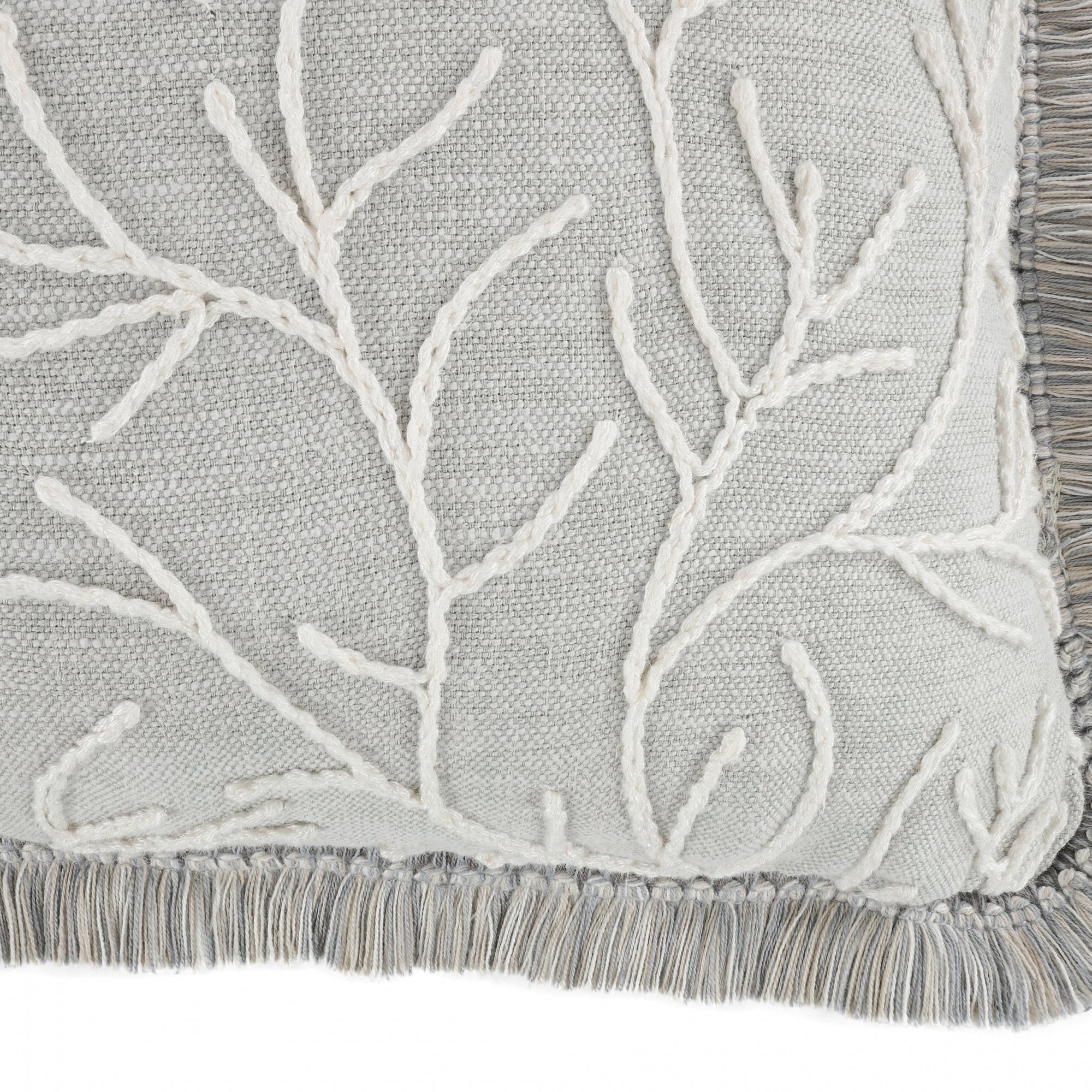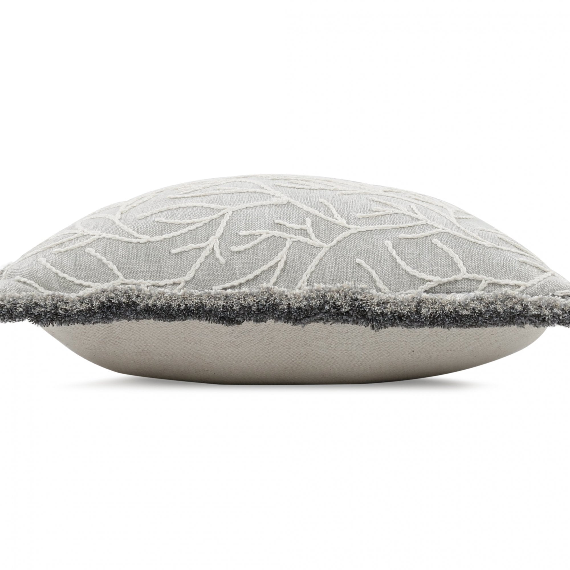 A creative cushion; corded embroidery outlines sprawling fronds on top of a softly textured cloth. An added textual detail, a stunning two-tone ruche borders this eye-catching readymade cushion.
