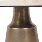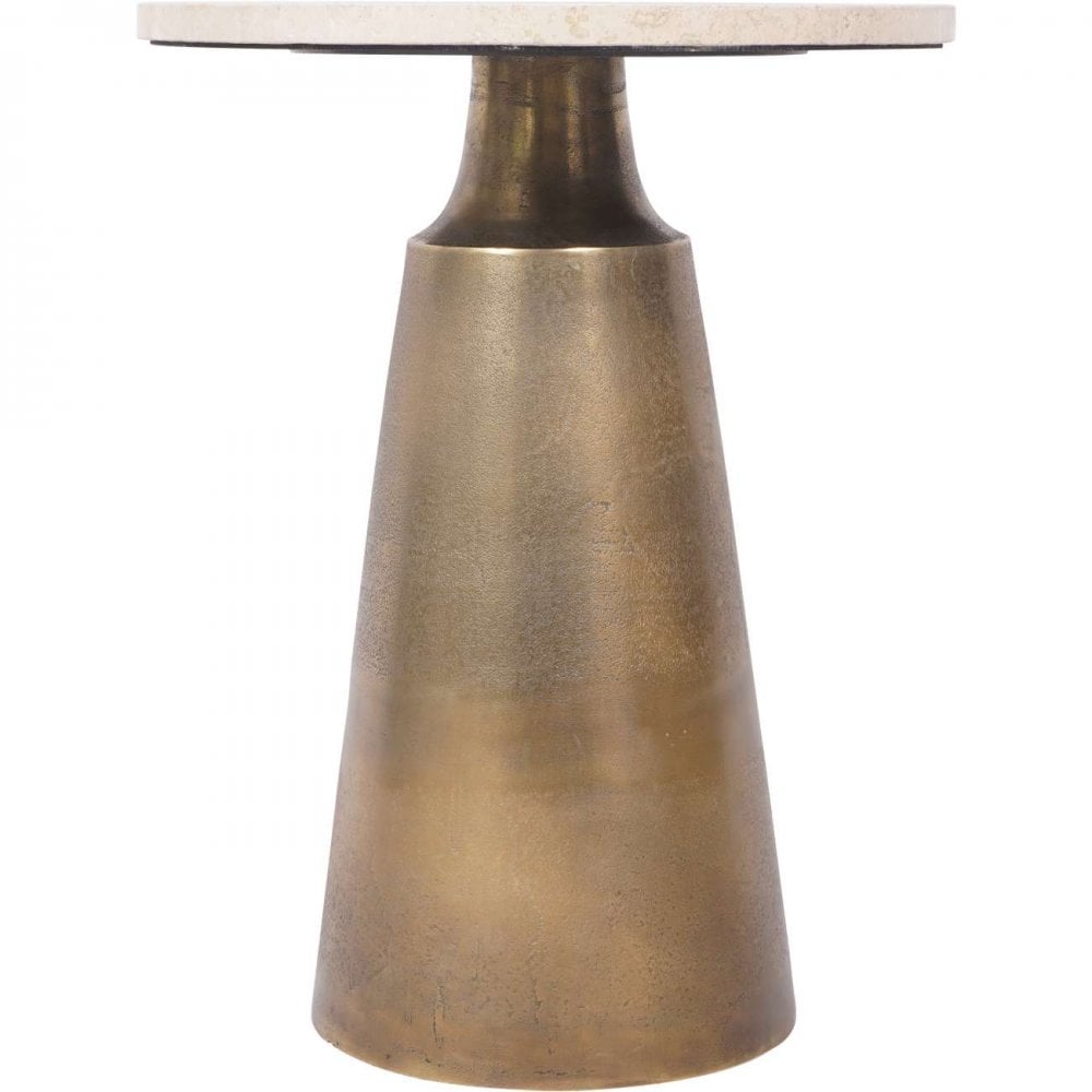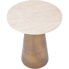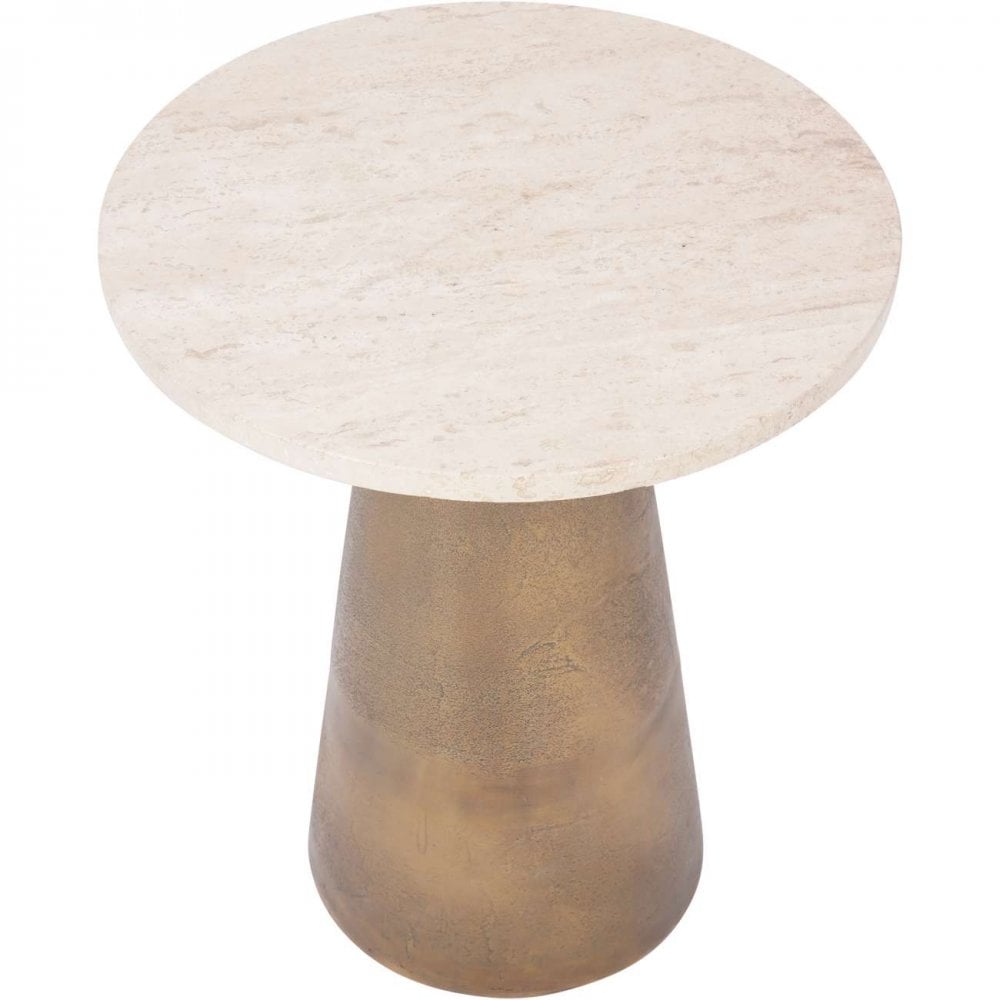 The round Antique Brass and Light Travertine Side Table is a charming piece of furniture that combines elegance with functionality. With a diameter of 40cm, it provides ample surface area for placing drinks, books, or decorative items, making it perfect for cozy living spaces or intimate seating arrangements.