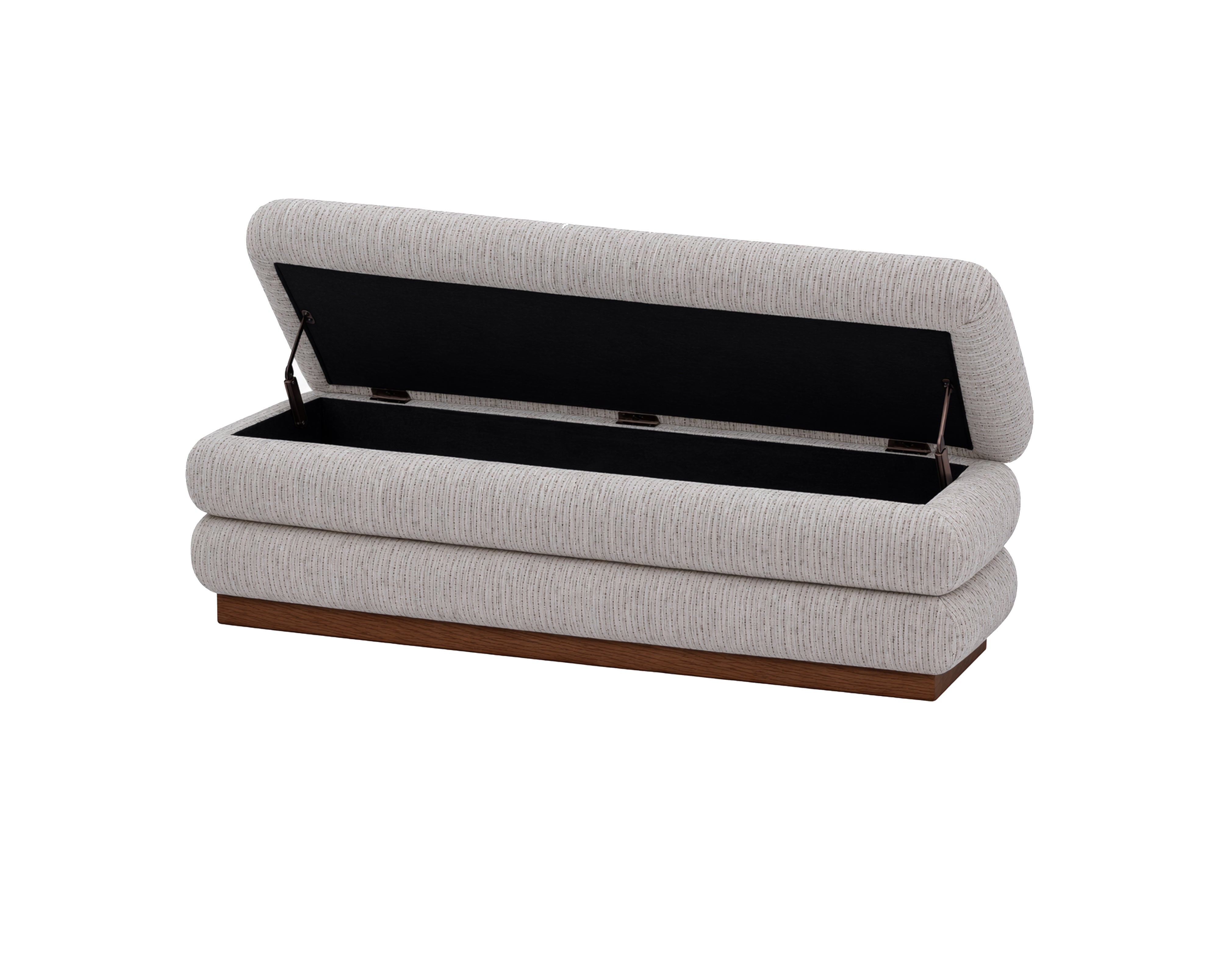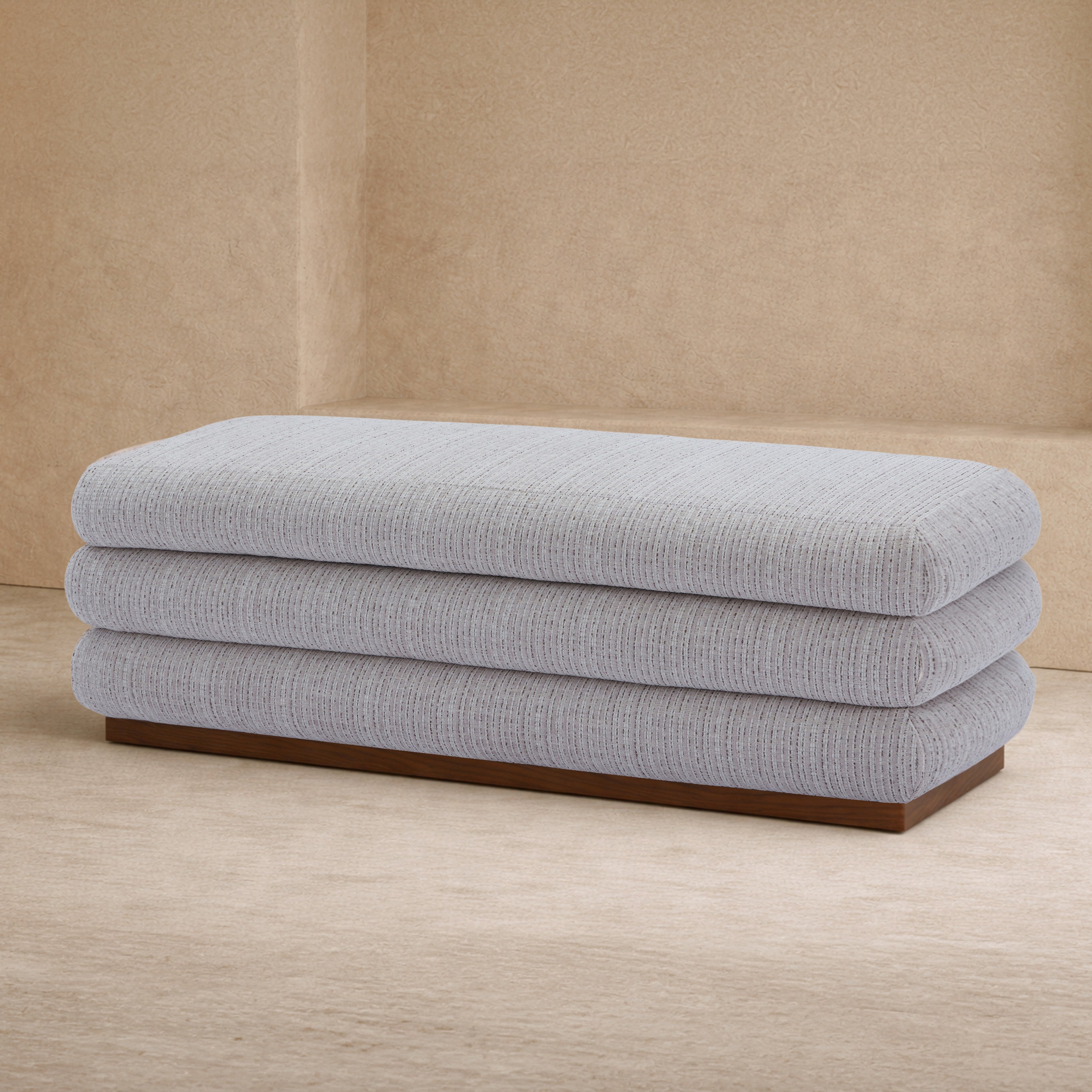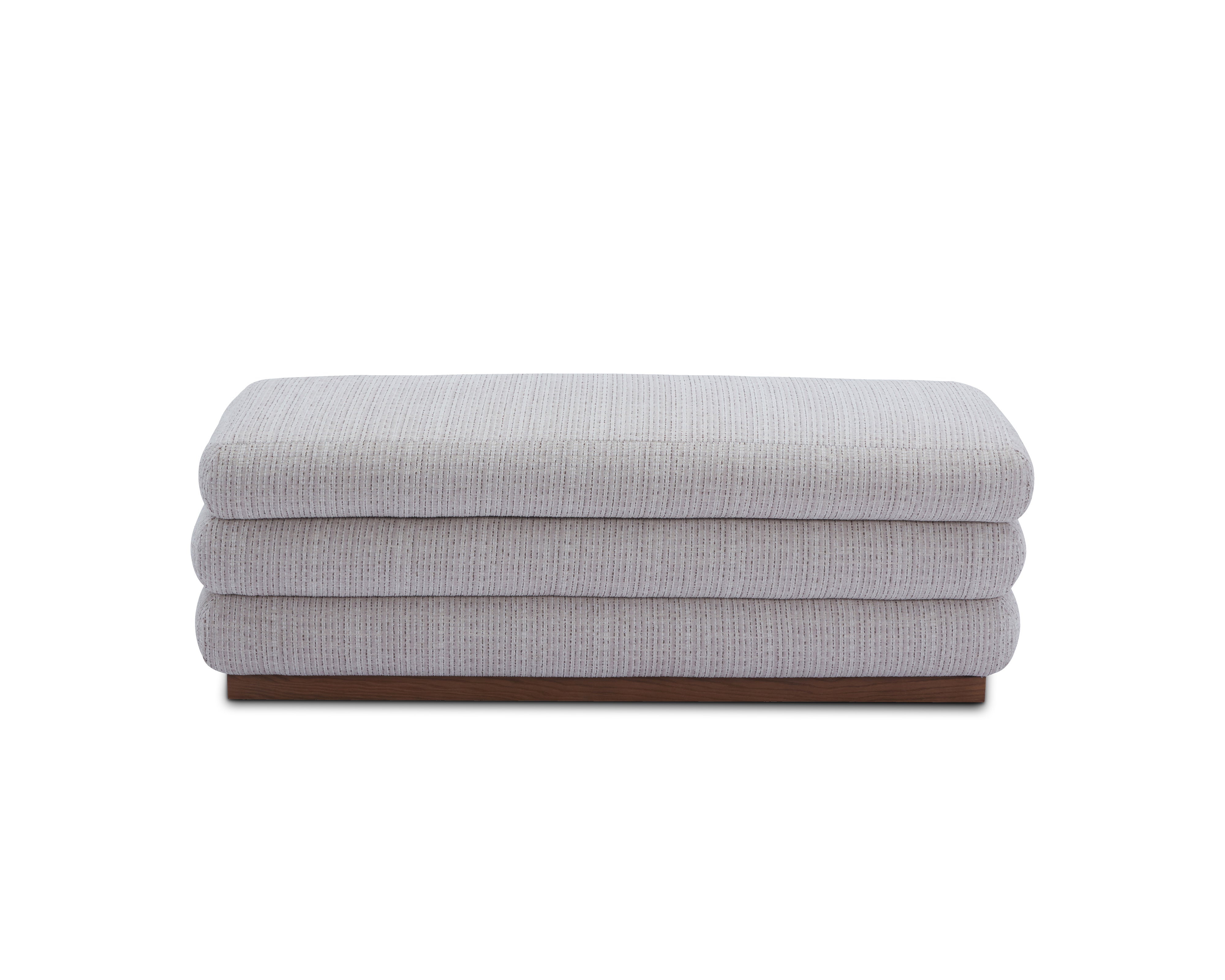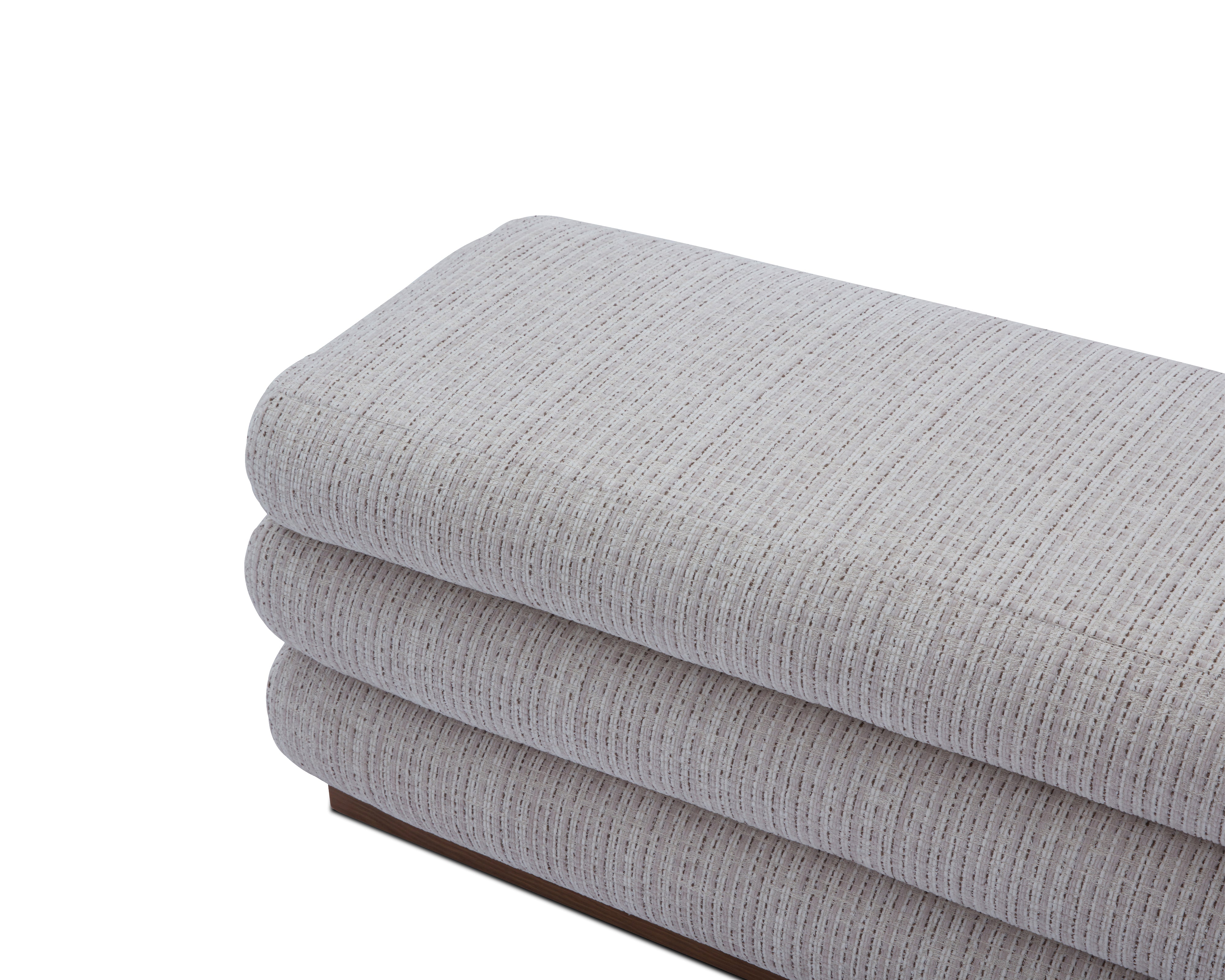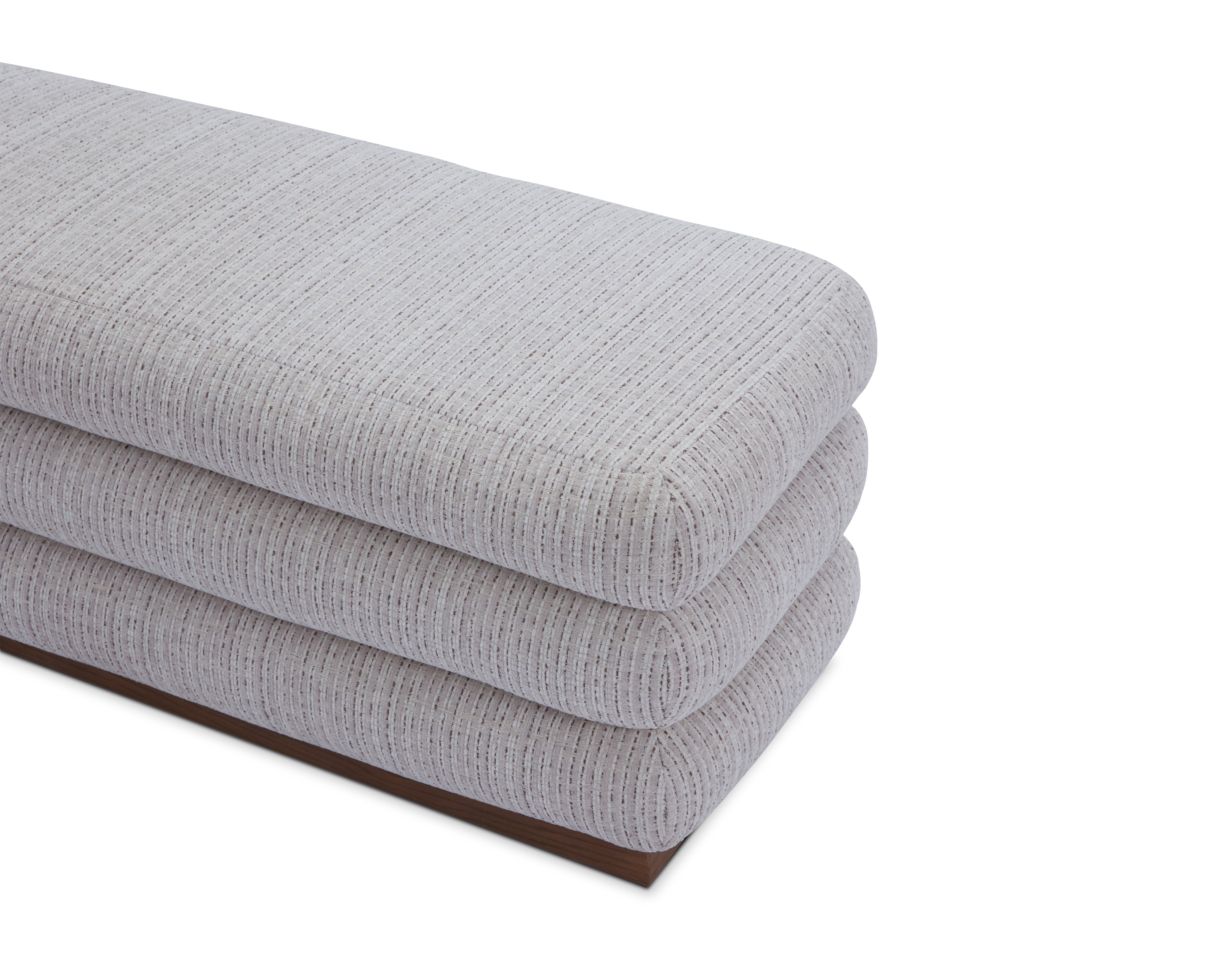 The Cloud Bench lives up to its name through soft, layered cushioning wrapped in textured Dresden Pebble upholstery with storage capabilities. Its horizontal, stacked silhouette creates a sculptural yet inviting presence, while the Mid Brown timber plinth grounds the design with warmth and definition. Designed to sit effortlessly at the end of a bed, within a dressing area or in refined hospitality settings, Cloud brings comfort, structure and understated luxury into perfect balance.