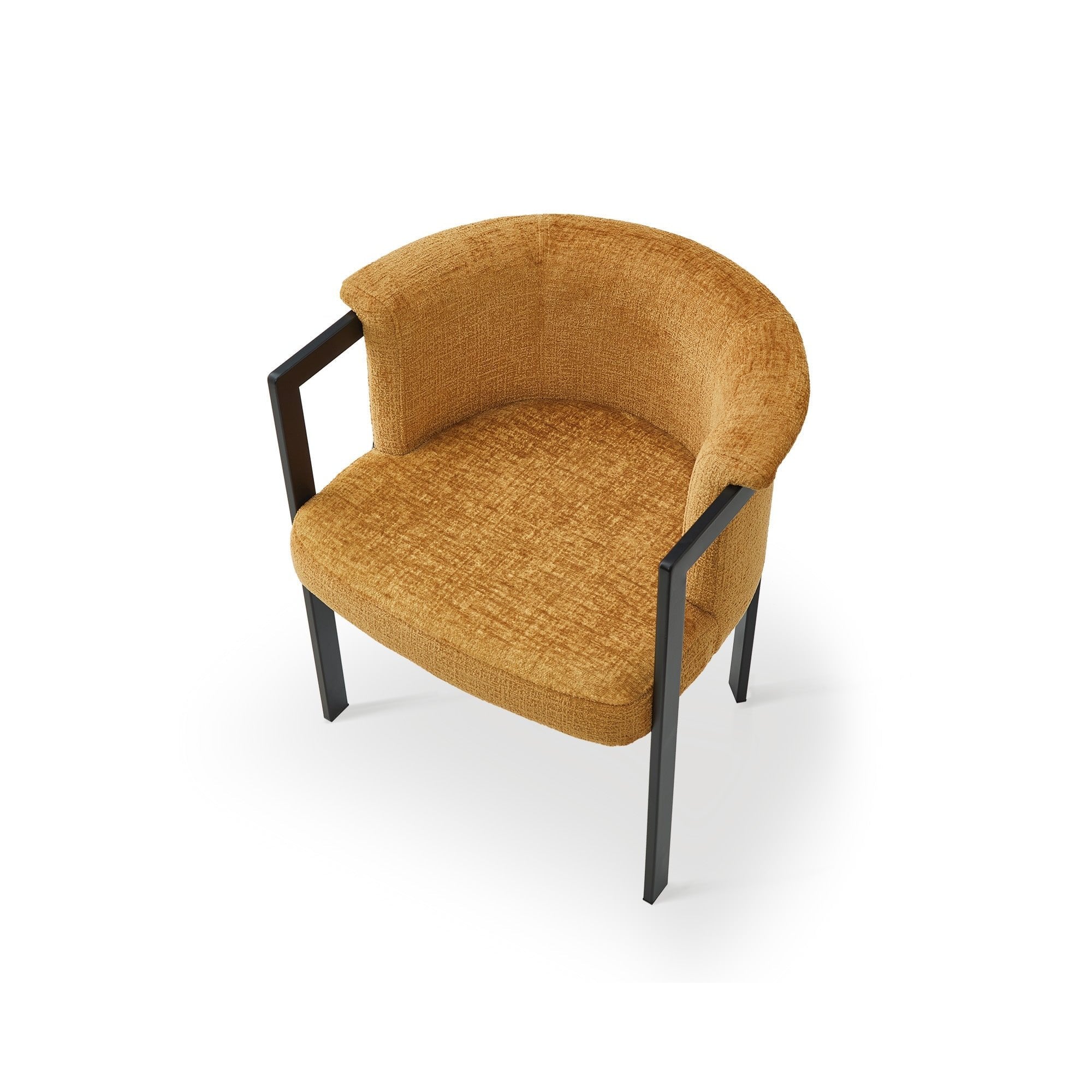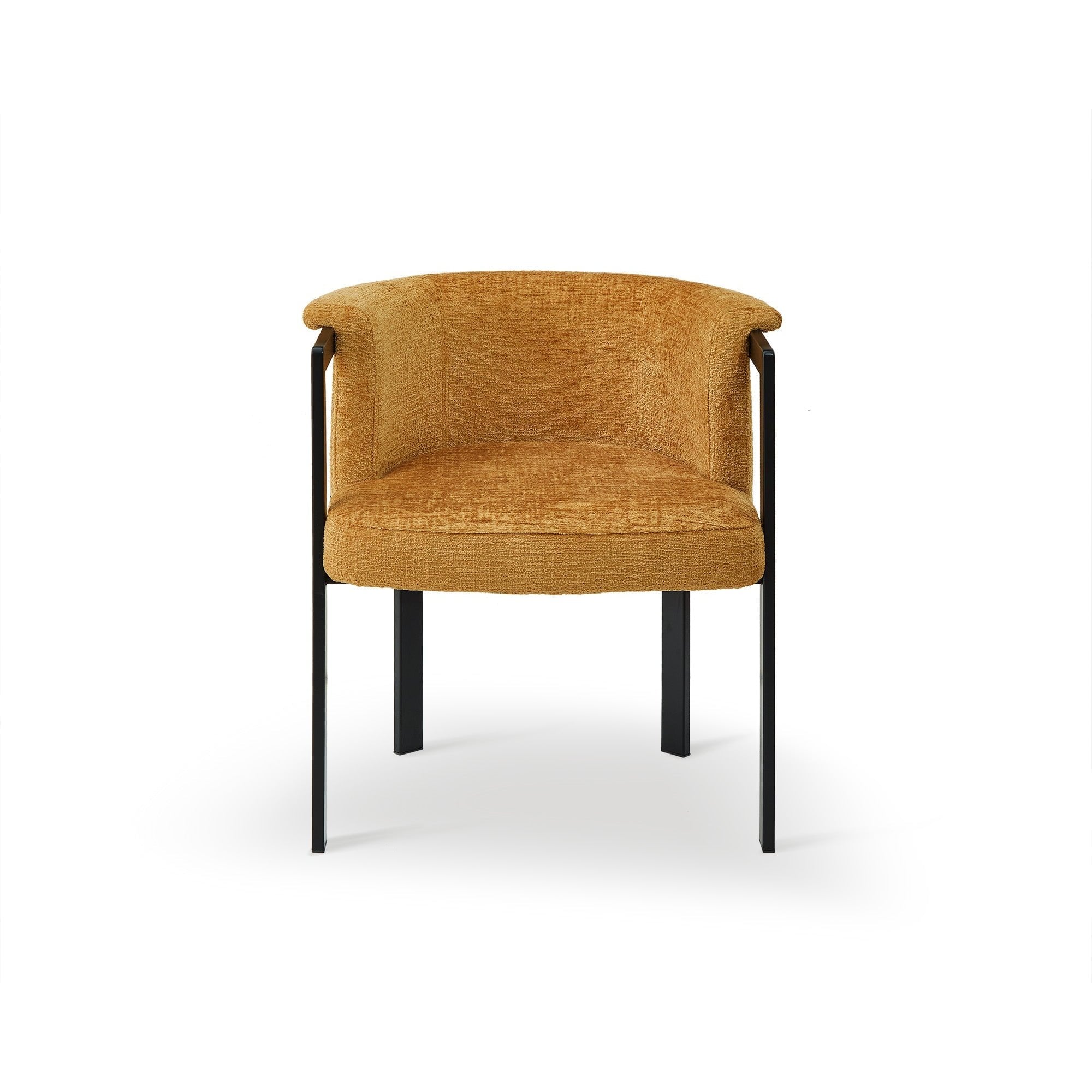 Elevate your dining experience with the Como Dining Chair in Bennett Mustard. Its striking blend of orange, mustard, and ochre hues adds warmth and character, making it a focal point in any dining area. Crafted with durable matt black steel legs and plush upholstery, this chair seamlessly combines comfort and style, perfect for both homes and restaurants.