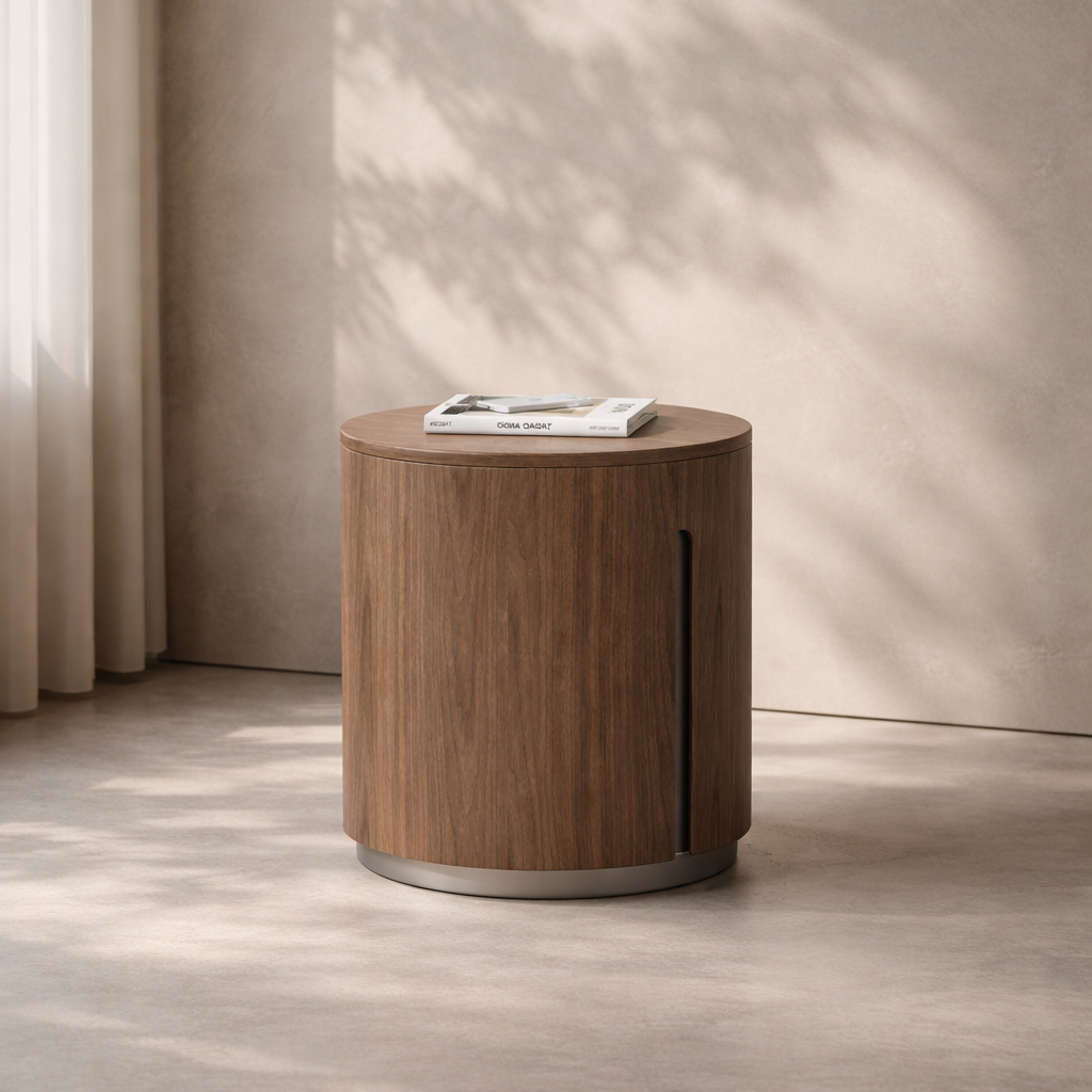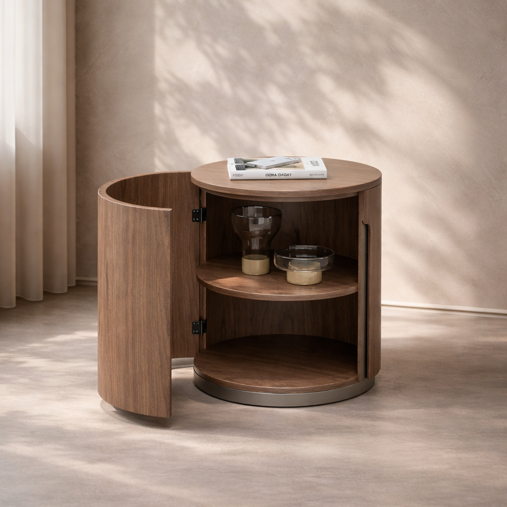 The Darcy Side Table is a refined blend of modern design and practical functionality, bringing understated sophistication to any living space. Crafted in a warm walnut finish, its smooth cylindrical silhouette creates a clean, sculptural form that feels both contemporary and timeless. A curved door seamlessly integrates into the design, opening to reveal internal shelving for discreet storage. This thoughtful feature allows everyday essentials such as books, remotes, or accessories to be neatly tucked away, helping maintain a clutter-free surface while preserving the table’s minimalist aesthetic. Compact yet versatile, the Darcy Side Table works beautifully beside a sofa or armchair, and can also double as a stylish bedside table when needed. Designed to coordinate perfectly with the Darcy Coffee Table, it completes a cohesive and modern interior arrangement.