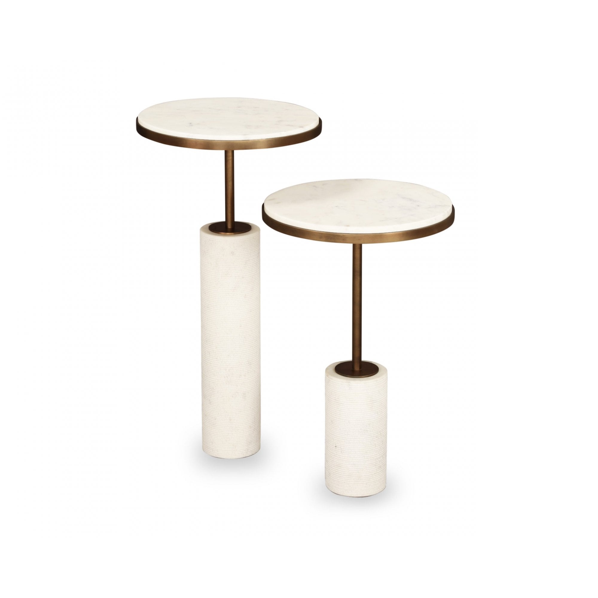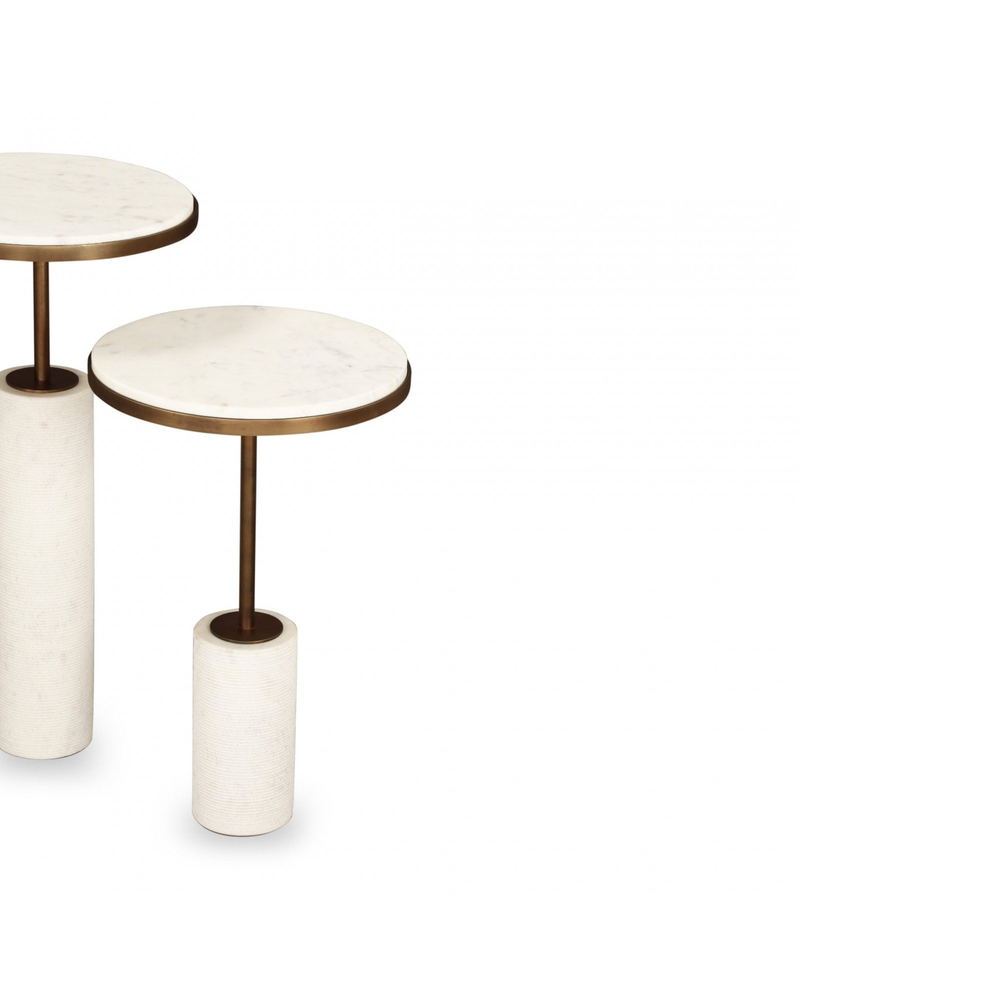 Indulge in the exquisite design of the Dolmec Nest of Tables, showcasing a harmonious blend of antique brass metal and white marble. The enchanting curves and ridged bases create a contemporary look perfect for luxurious lounges. These nesting tables offer versatility, combining style with practicality, enhancing any indoor setting with sophistication.