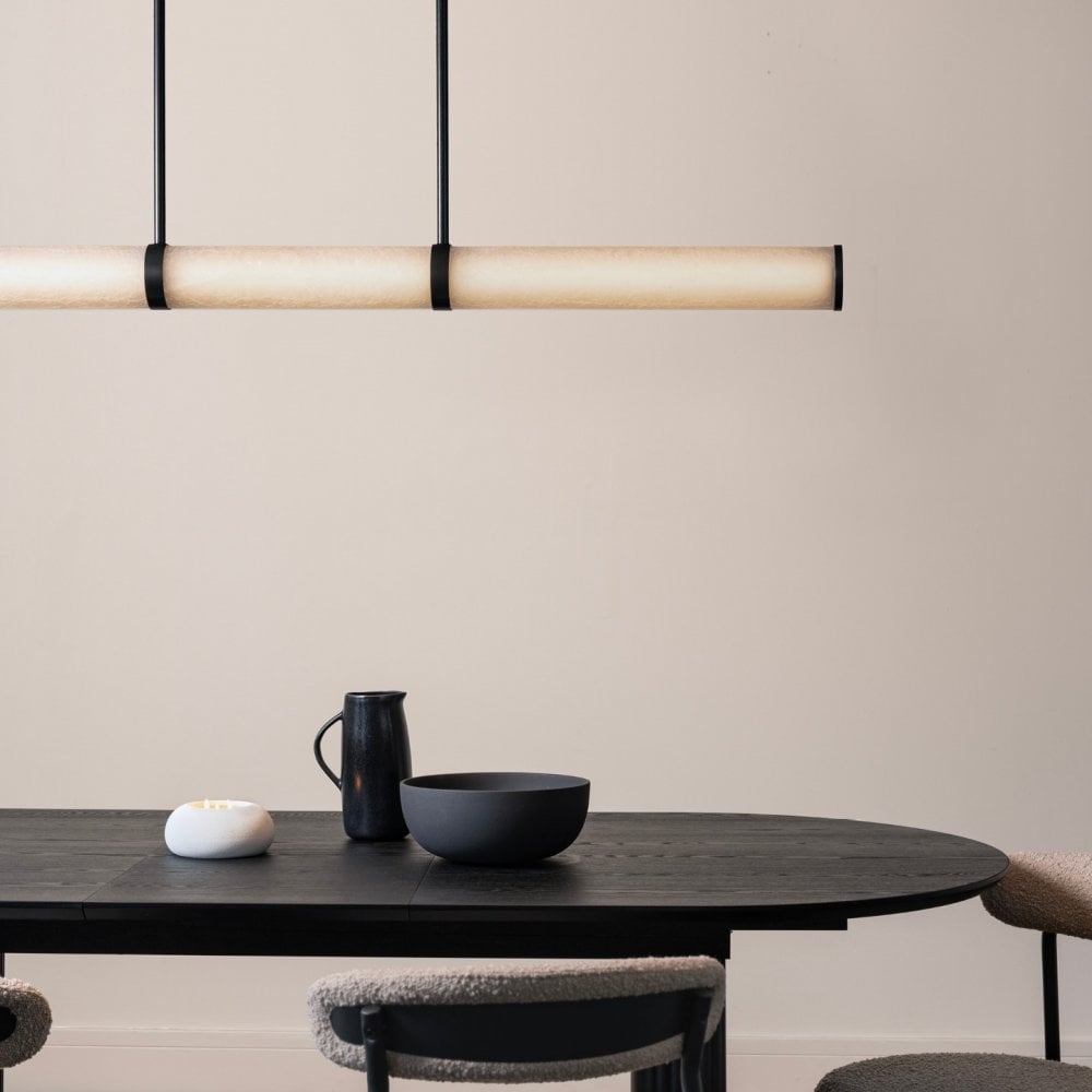 Our designers have paired hand-blown frosted crackle glass tubes with sleek Blackened Bronze metalwork. The integrated warm LED light source highlights the subtle glass patterning and casts a soft glow. This pendant would create a striking focal point above a kitchen island or dining table.